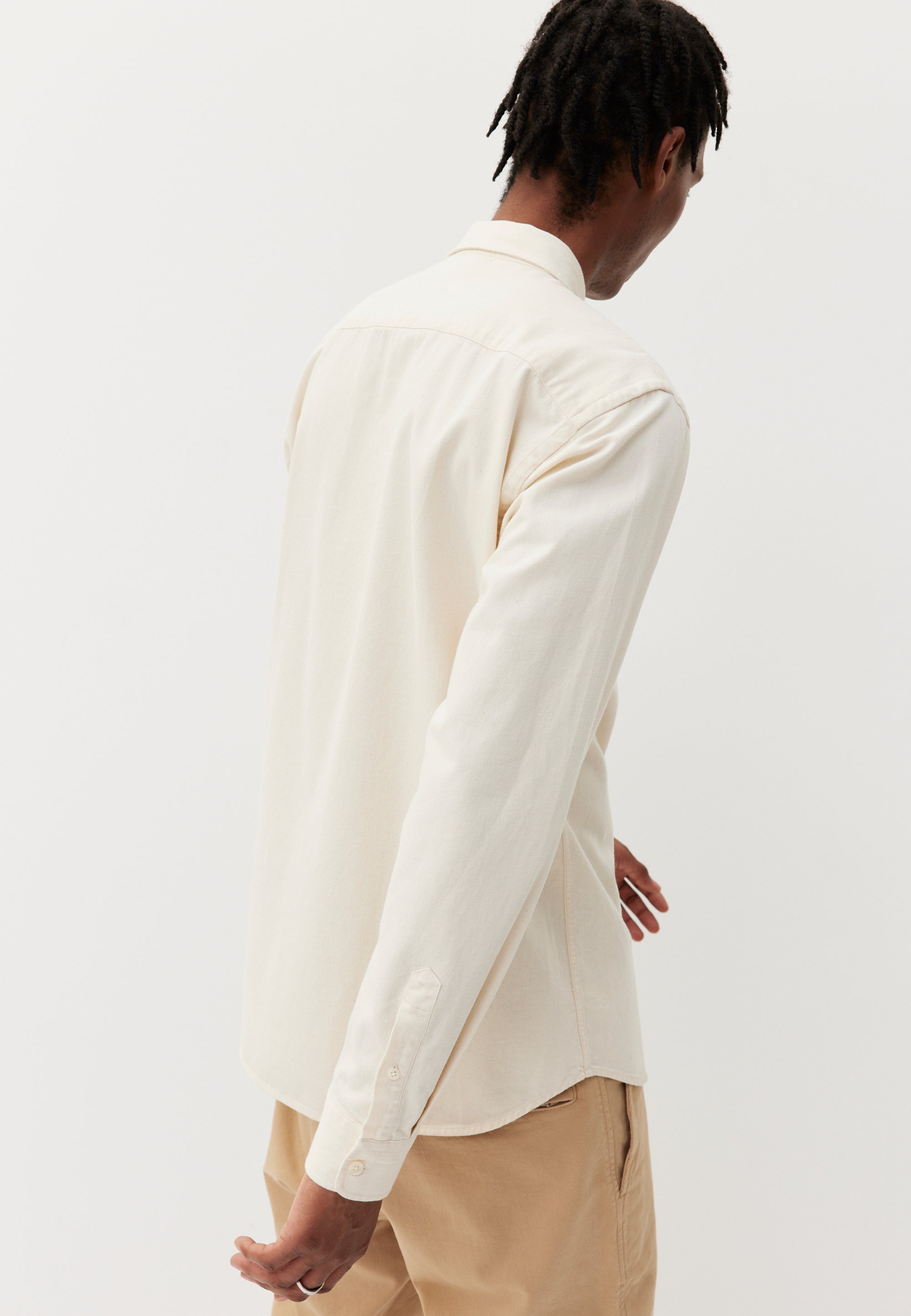 Pour cette chemise, nous n'avons pas utilisé de teinture - cet écru, c’est la vraie couleur du coton (bio). En regardant de près, on distingue toutes les petites irrégularités de cette matière naturelle, qui donnent une profondeur subtile à cette chemise en jean. Cerise sur le gâteau : en squizzant l’étape de teinture, on fait aussi l’impasse sur plein de produits chimiques et de gaz à effet de serre. Oui, elle est belle, mais elle est aussi robuste : le tissu est plutôt dense (235g/m2), le col est maintenu par des boutons cachés, les boutons sont épais et leur fixation est renforcée.