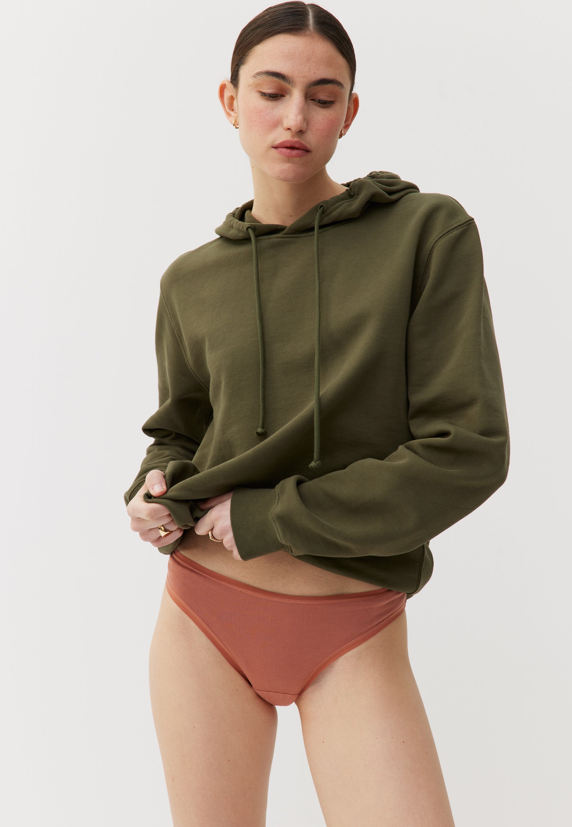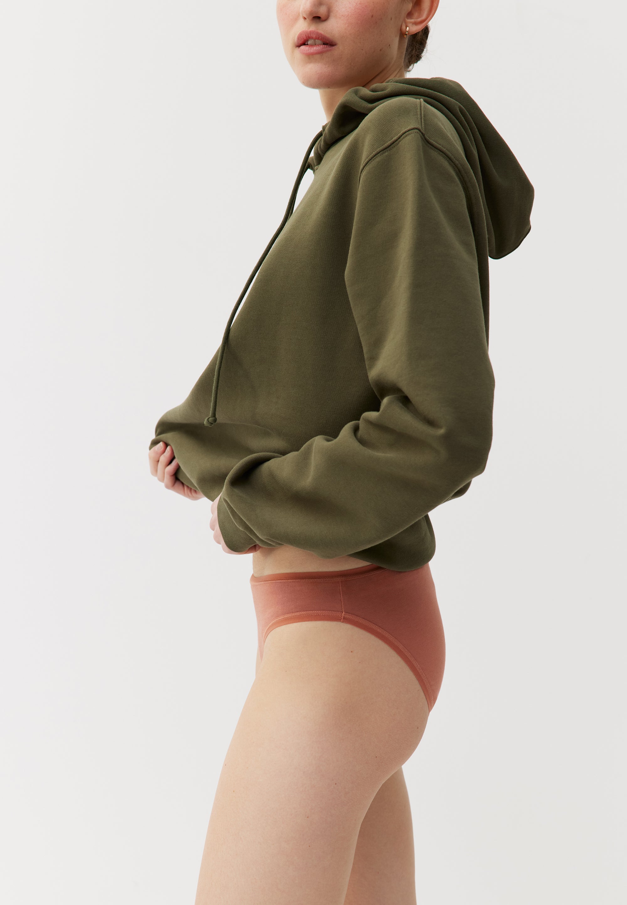 Si la culotte vous apparaît un peu brillante au départ, c'est normal aussi : cet aspect légèrement soyeux est dû à la finesse des fibres de coton qui lui donnent sa douceur et sa résistance. Mais pas d'inquiétude, cette brillance a tendance à disparaître au fur et à mesure des lavages.