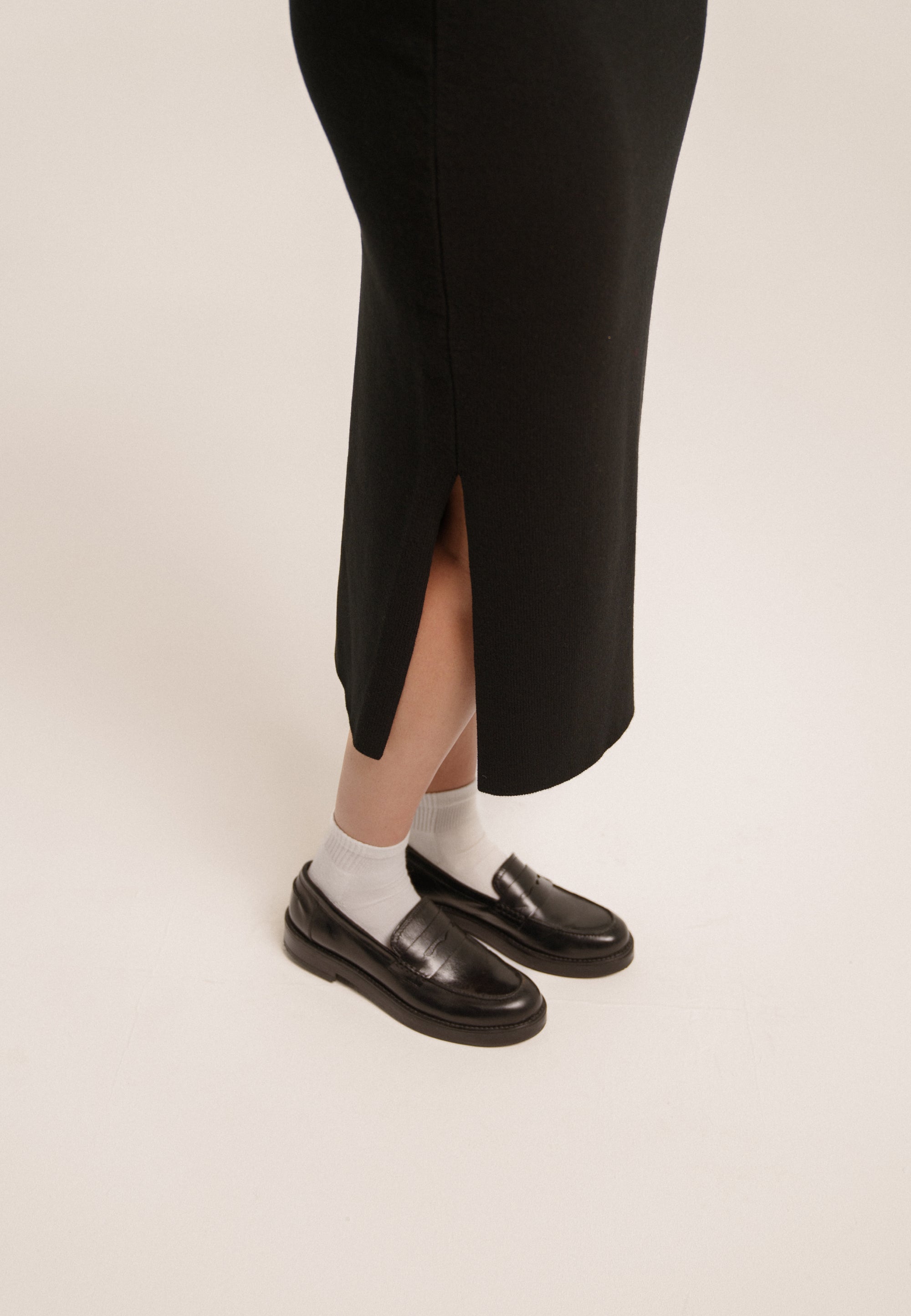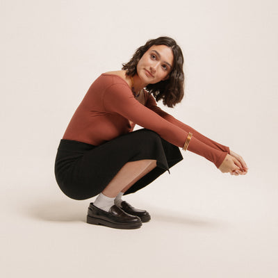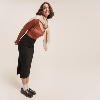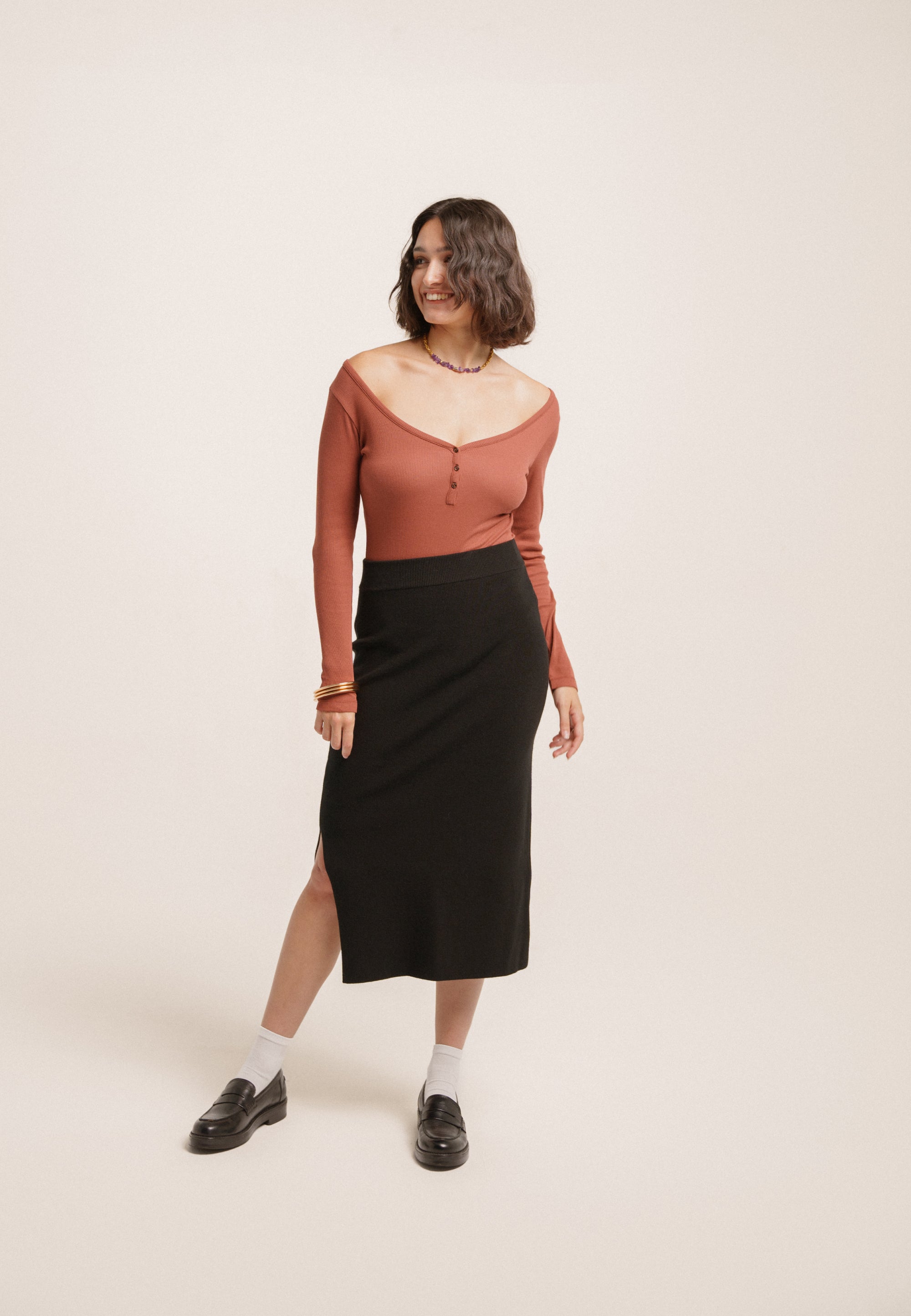 On voulait faire une jupe du quotidien, élégante mais facile à porter. D’où le choix de la “maille perlée” : c’est un point de tricot naturellement élastique (et canon). D’où le choix d’une ceinture élastiquée : c’est confortable, ça va à tout le monde et ça permet de la porter taille haute ou plus basse. Va aussi bien avec des talons que des baskets, un t-shirt déchiré qu’une chemise bien repassée.