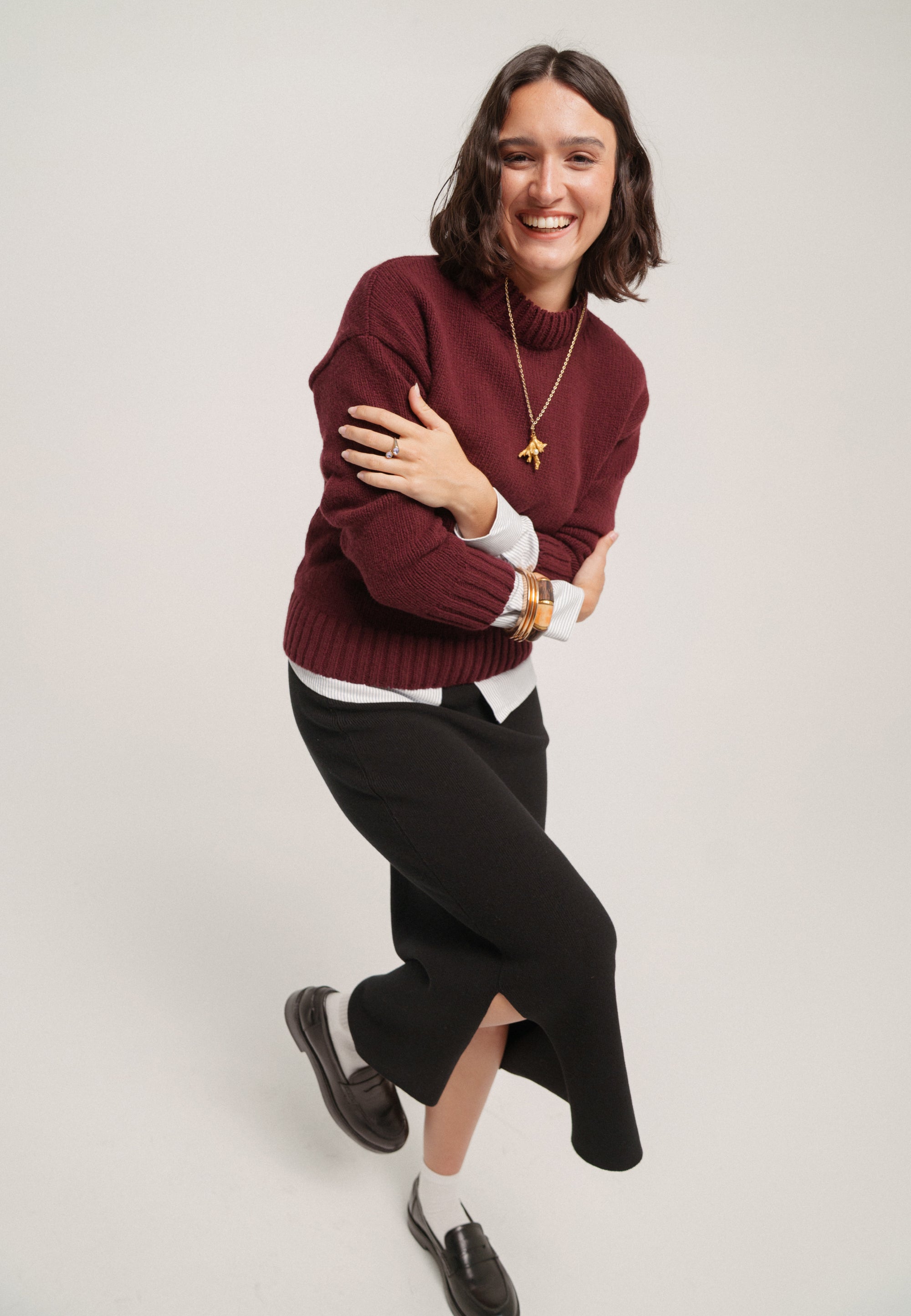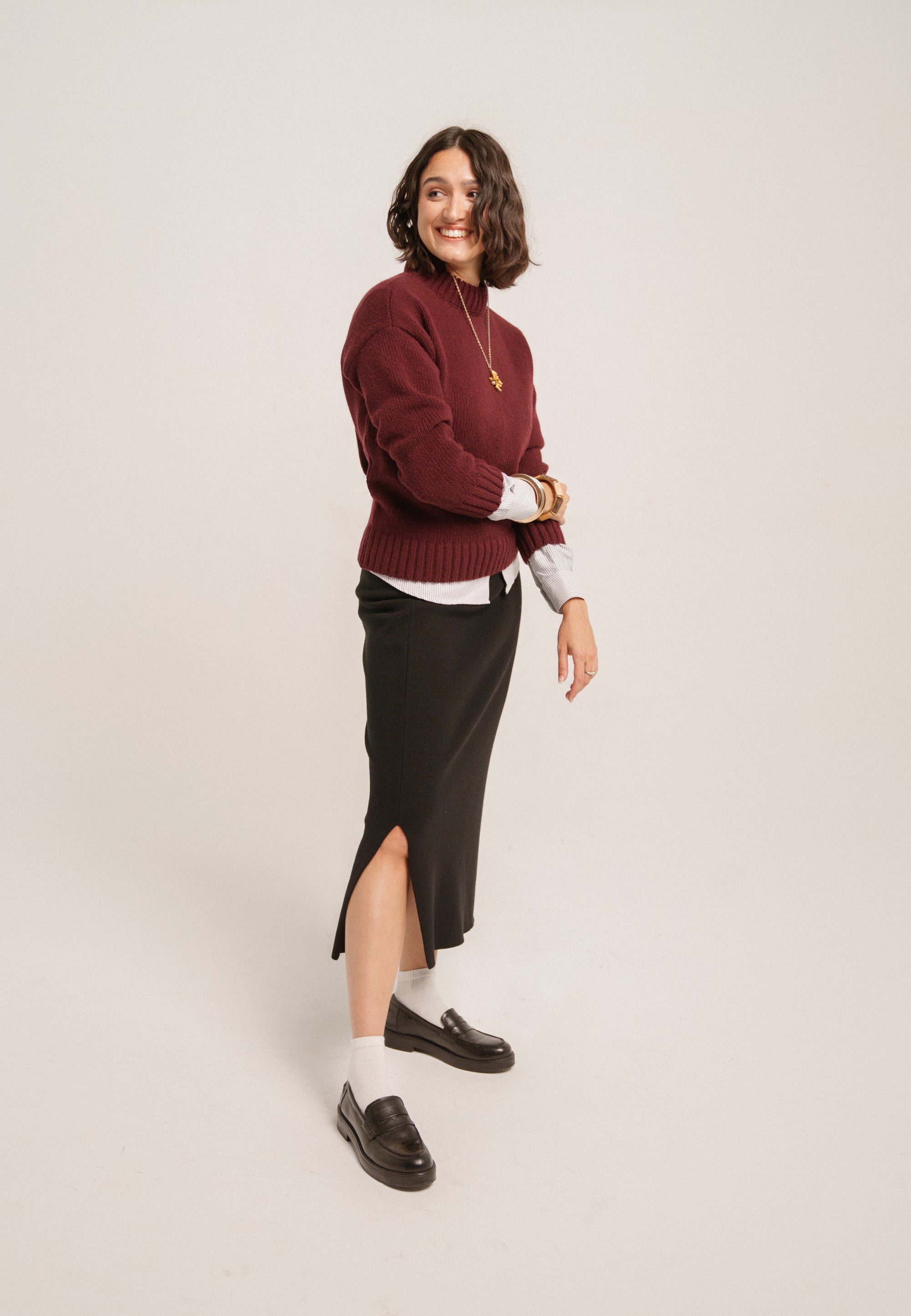 La laine qu’on utilise est certifiée RWS (c’est la meilleure certification qu’on connaisse pour le bien-être animal). Quant au coton, il est bio (certifié GOTS). Il n'empêche que produire, c’est polluer : le plus important, ce sera de garder cette jupe des années !