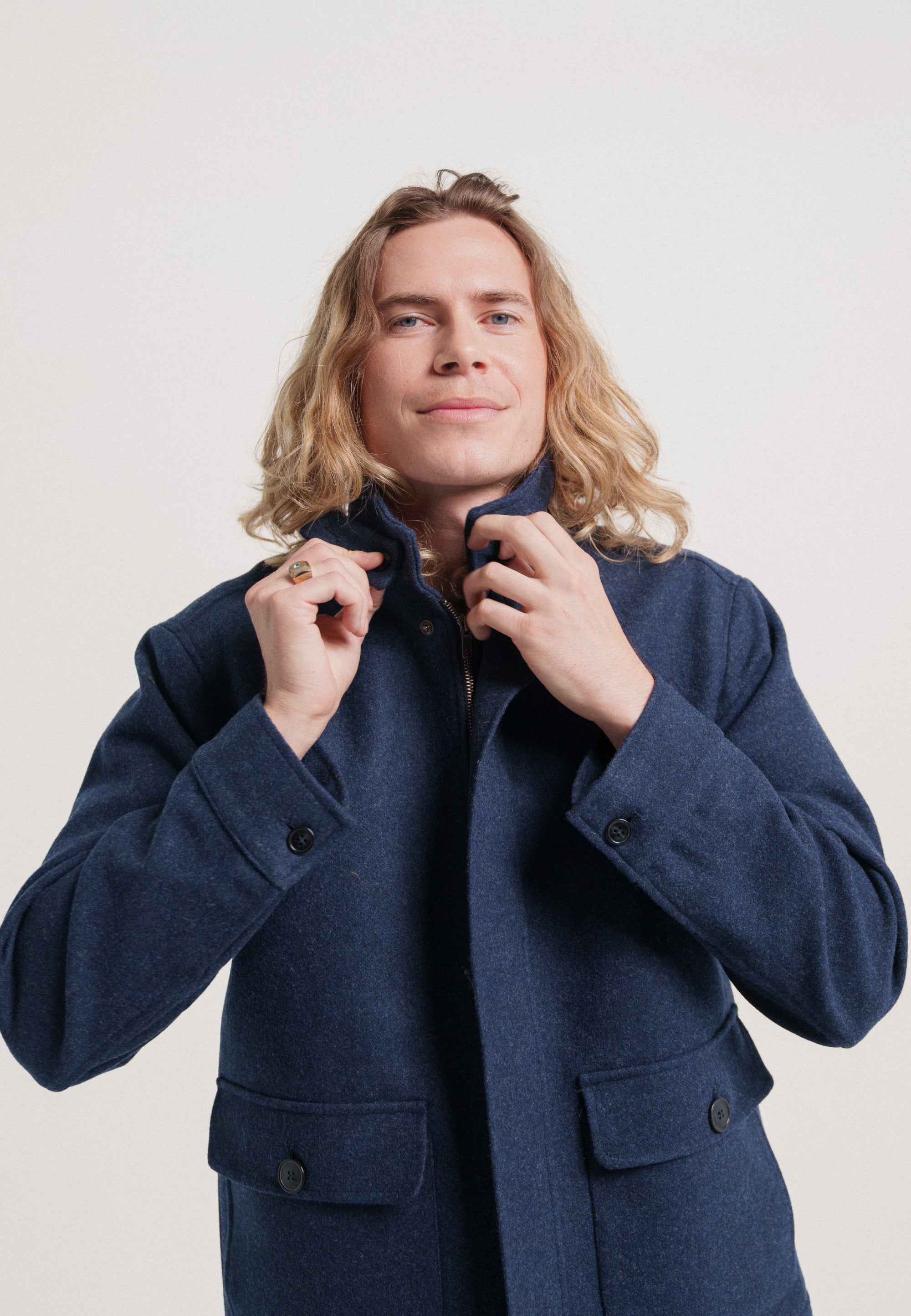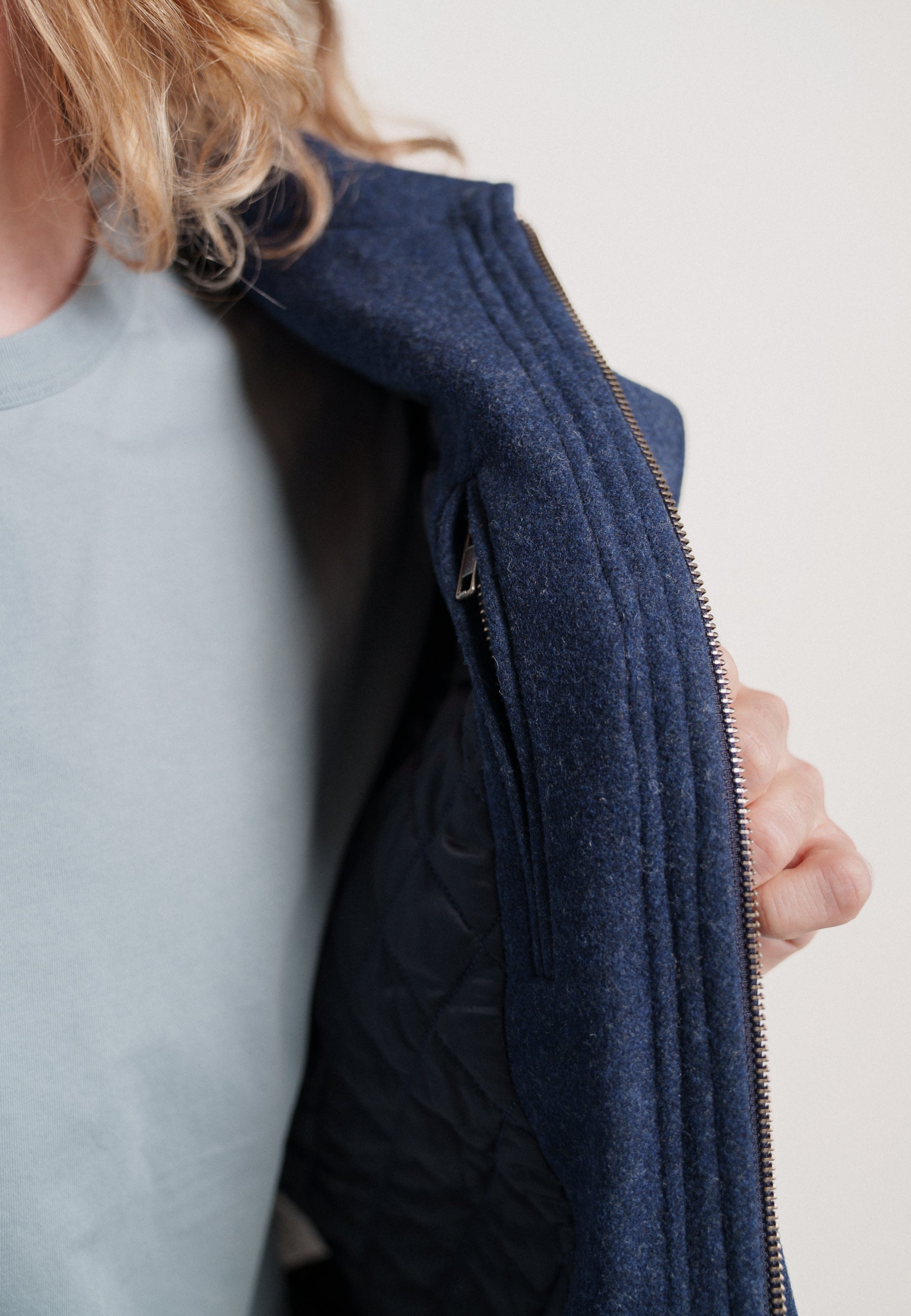 Un long manteaux, c'est élégant mais pas vraiment pratique quand on veut enfiler un sac à dos ou enfourcher un vélo. On a donc choisi une coupe courte, type blouson, pour ne pas entraver vos mouvements, avec un tombé droit pour pouvoir le porter avec un gros pull. Il a deux grandes poches frontales pour mettre bonnet, gants ou carnet de note, et une poche intérieure, profonde et zippée, pour ce qu’il y a de plus précieux.