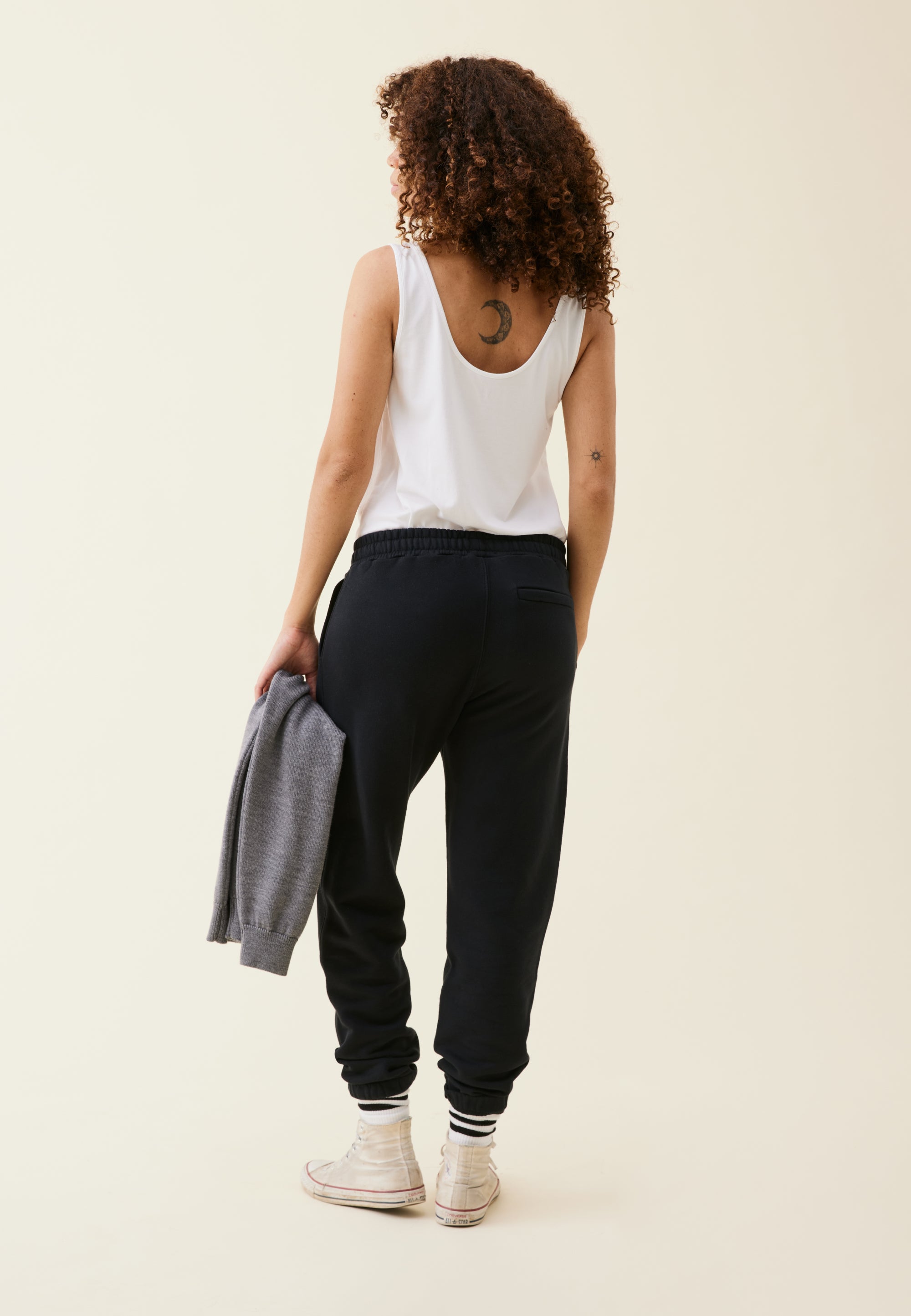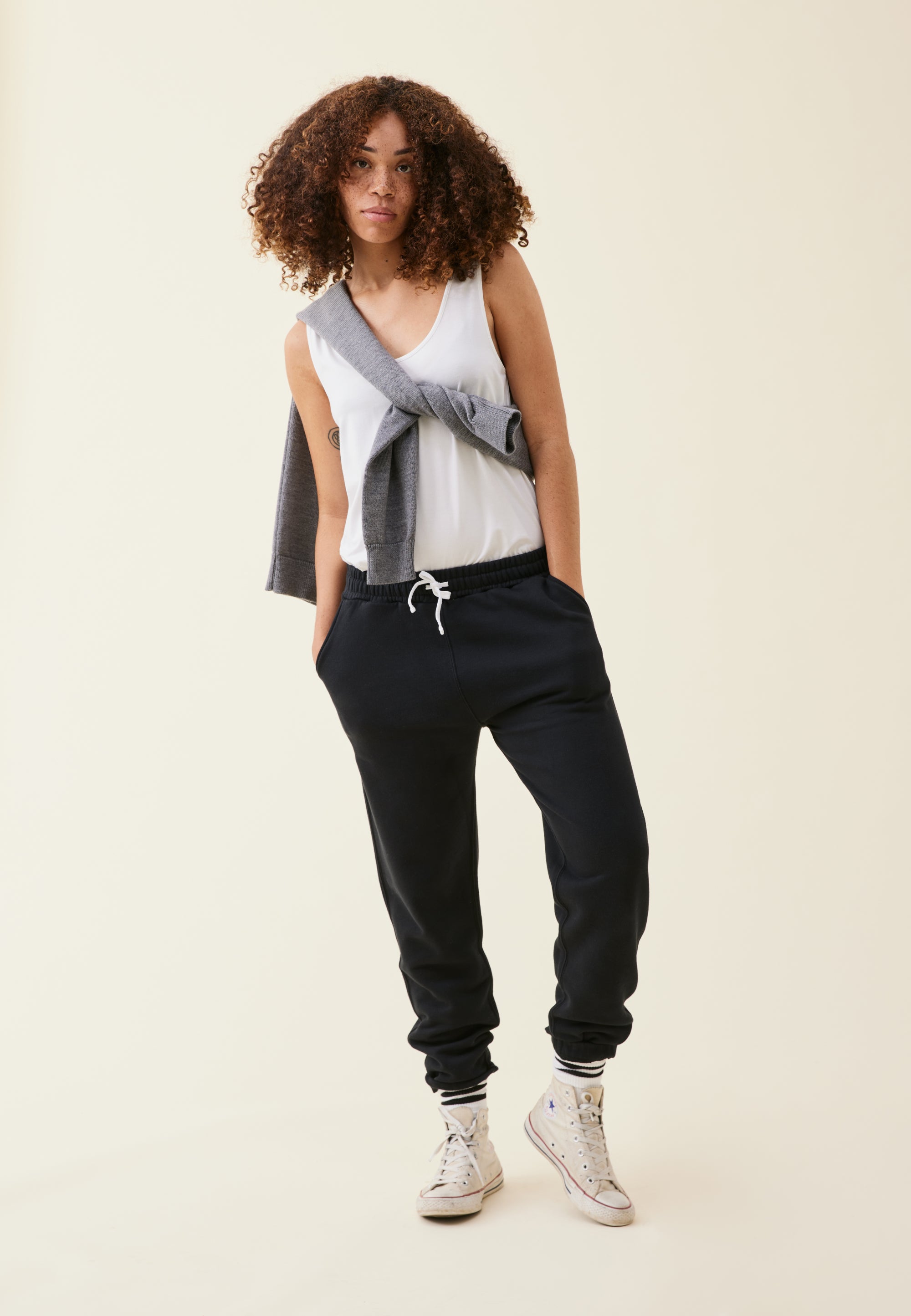 On a travaillé une jambe confortable : c’est un jog, pas un legging, on a le droit à de l’espace - STOP - Le cordon blanc fait un joli contraste avec la matière noire - STOP - Le bas est resserré avec un élastique, plus esthétique que les bords-côtes habituellement utilisés.