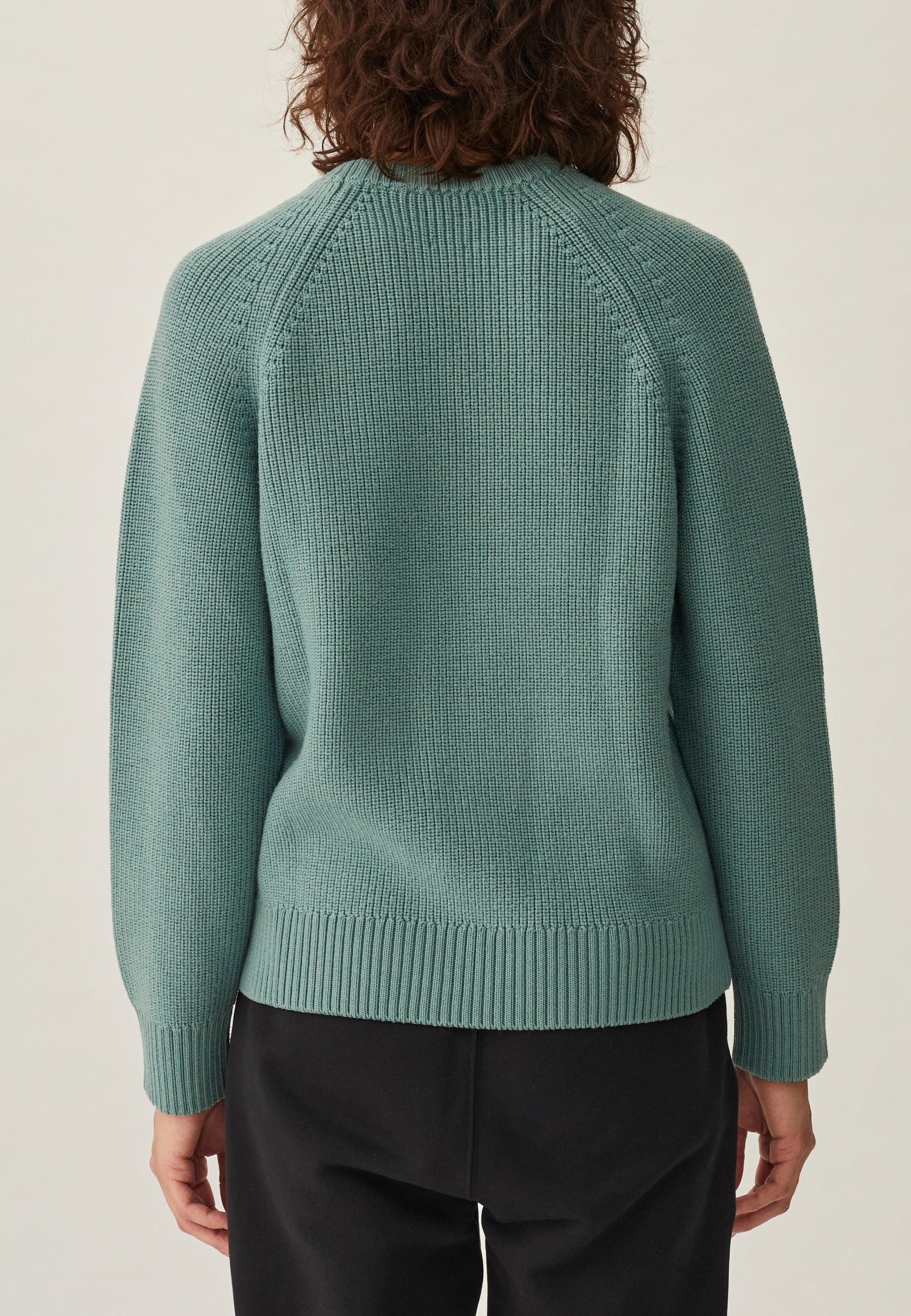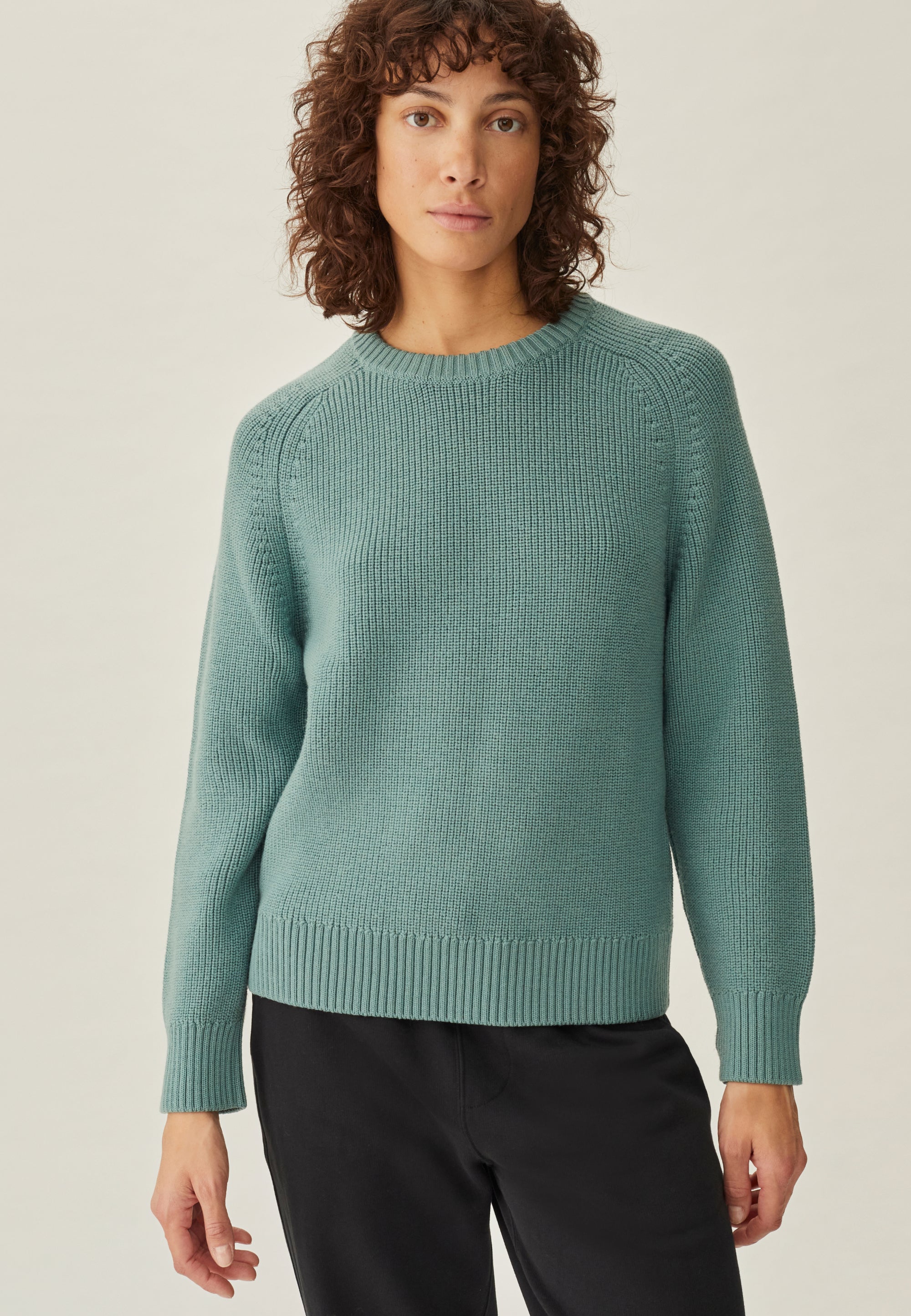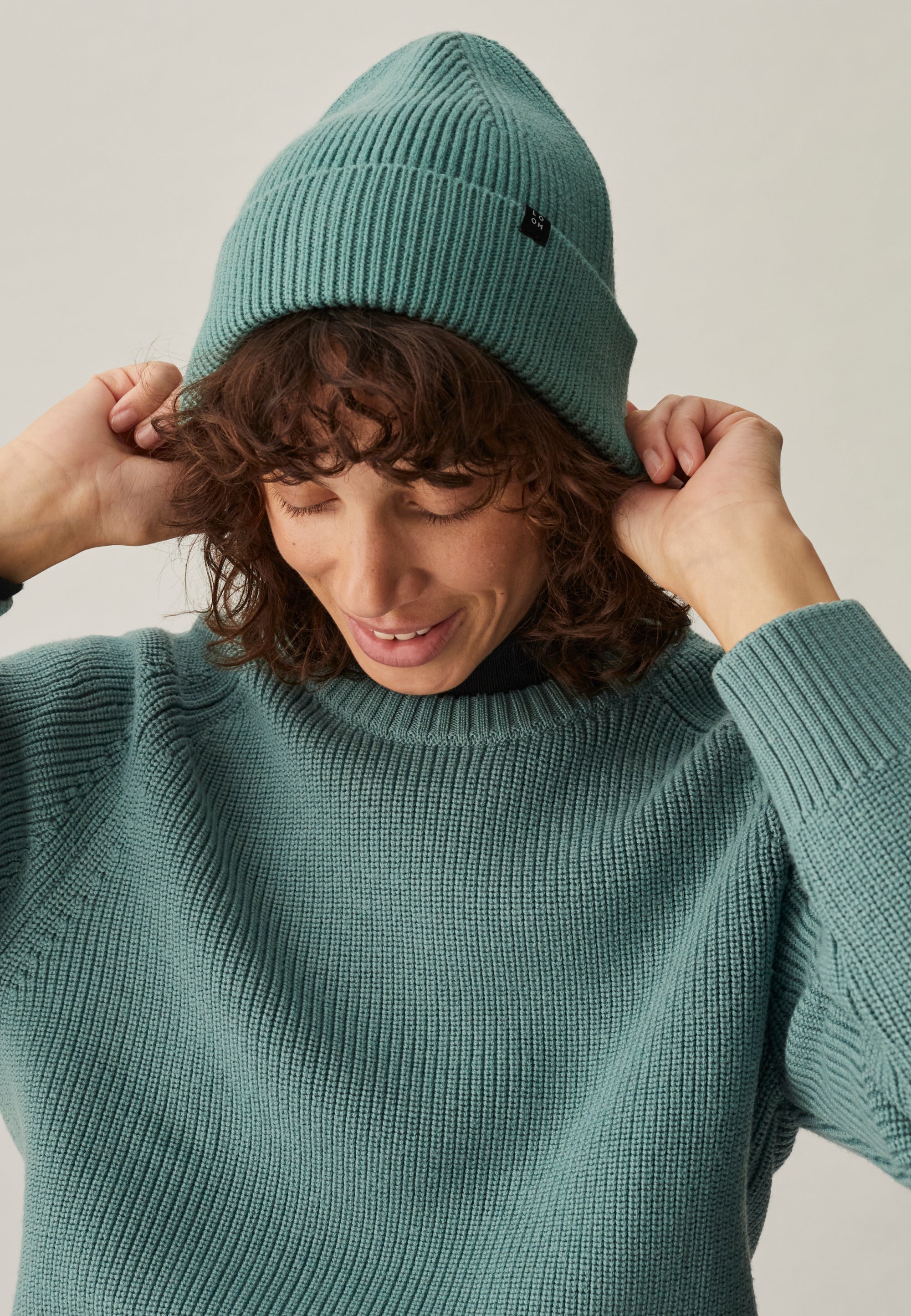 Le pull est légèrement ample, un peu "oversize", et l’ouverture des manches est généreuse pour laisser passer une chemise. Mais il n’est pas trop large non plus pour pouvoir enfiler un manteau par-dessus, et pas trop court pour que le froid ne rentre pas au niveau du bassin. L’assemblage est “fully fashioned” pour des coutures moins épaisses et plus agréables. Et on a choisi un point appelé “maille perlée” : c’est très beau mais surtout c’est naturellement extensible, et ça c’est bon pour le confort.