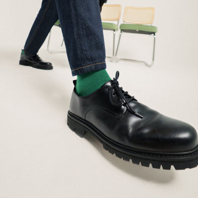 De belles chaussures qui ne sont pas prêtes de vous lâcher avec leur cuir pleine fleur et leur semelle Vibram ultra résistante. Pour leur donner un look moderne et pas guindé, on a opté pour un arrondi généreux à l’avant du pied et une semelle épaisse crantée. Des derbies faciles à porter au quotidien, aussi bien avec un jean qu’une tenue habillée.