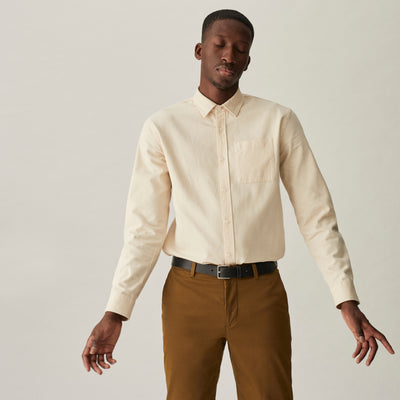 Certaines chemises ont des détails de confection qui plaisent aux puristes, mais qui – entre nous – ne servent pas à grand-chose. Alors on les a retirés pour ne pas vous faire payer trop cher : bye bye les hirondelles de renforts, le pli d’aisance, les coutures à 8 points par cm et le deuxième bouton à la manche. Résultat : une chemise à la coupe un peu ajustée (sans être trop cintrée) avec juste ce qu’il faut pour garantir sa solidité.