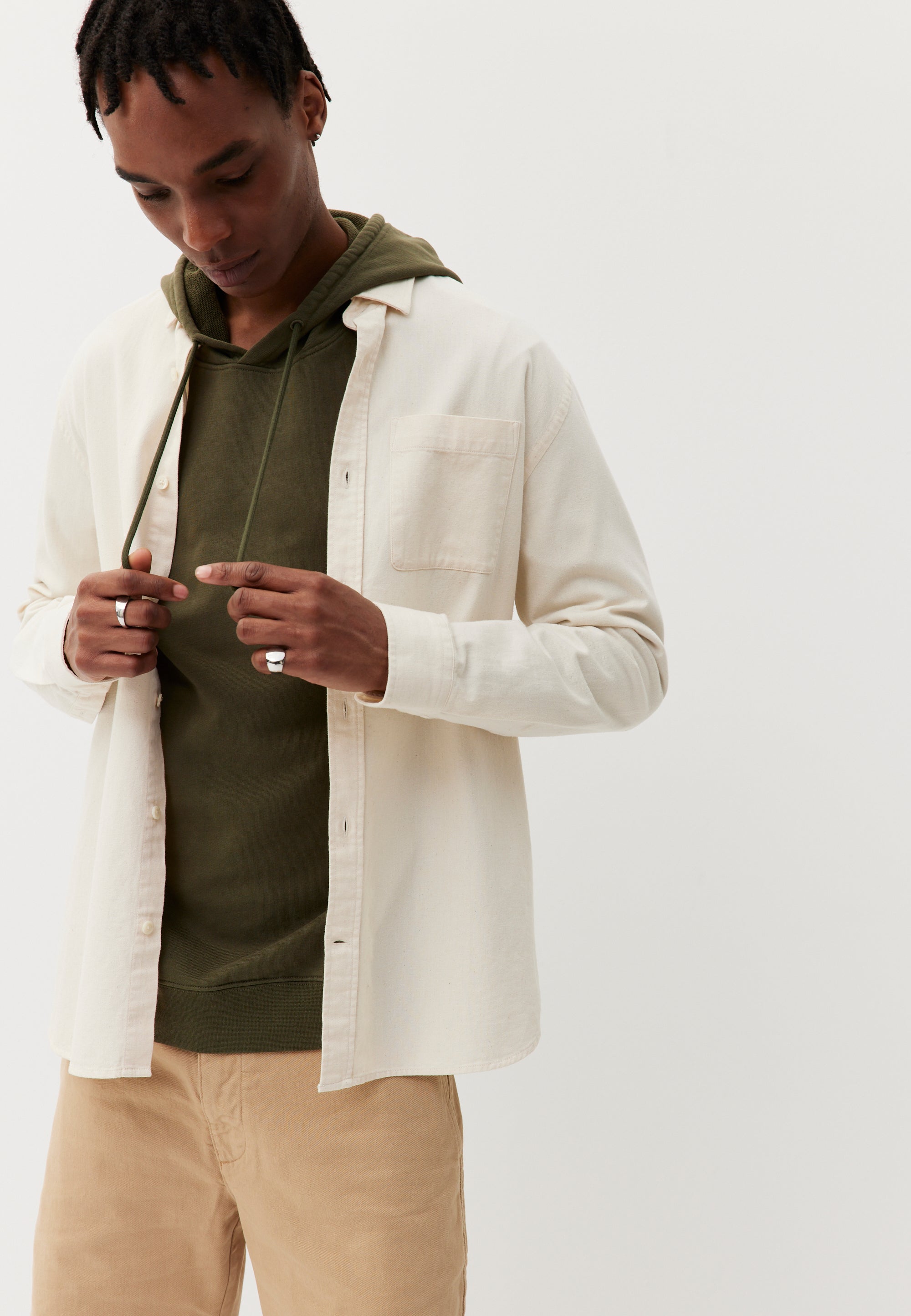 Notre chemise écrue n’est pas teinte : elle a la couleur naturelle du coton tel qu’il a été récolté dans les champs. Et ça change tout. Parce que teindre des vêtements nécessite 1) plein de produits chimiques 2) beaucoup d’eau et 3) de l’énergie pour la chauffer. Bilan : on minimise le risque de rejets toxiques, on épuise moins les nappes phréatiques et on réduit de 15% nos émissions de gaz à effet de serre. Et en plus, cette couleur est canon, non ?