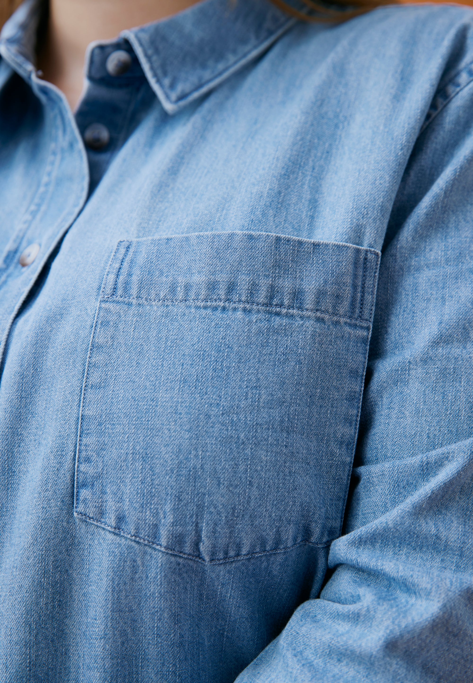 Cette chemise va super bien vieillir - c’est ce qu’il y a de génial avec le denim de qualité, ça patine avec le temps. Et on en est d’autant plus sûr qu’on a le recul de la version homme (fabriquée avec le même tissu). Comme n'importe quelle chemise en denim, elle délavera avec les lavages, particulièrement sur les zones de frottement comme les coudes ou le col.