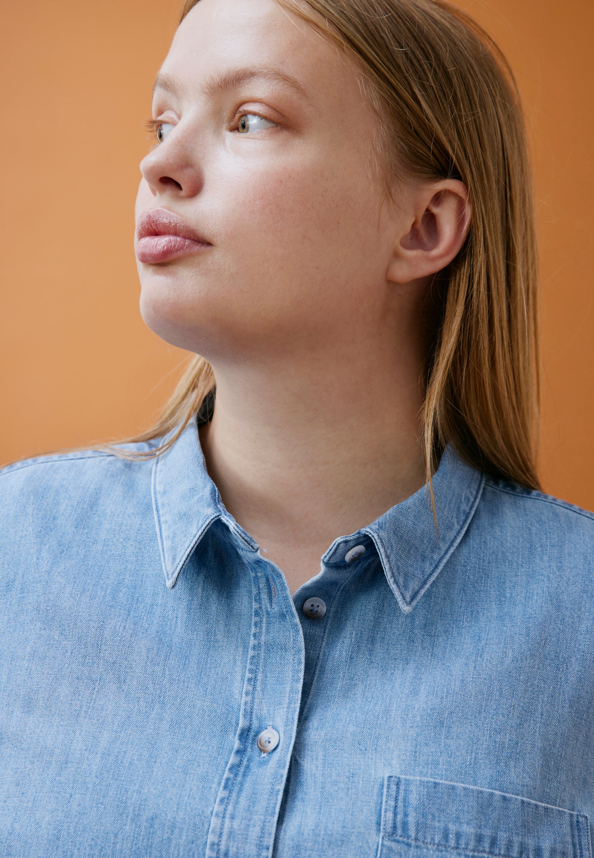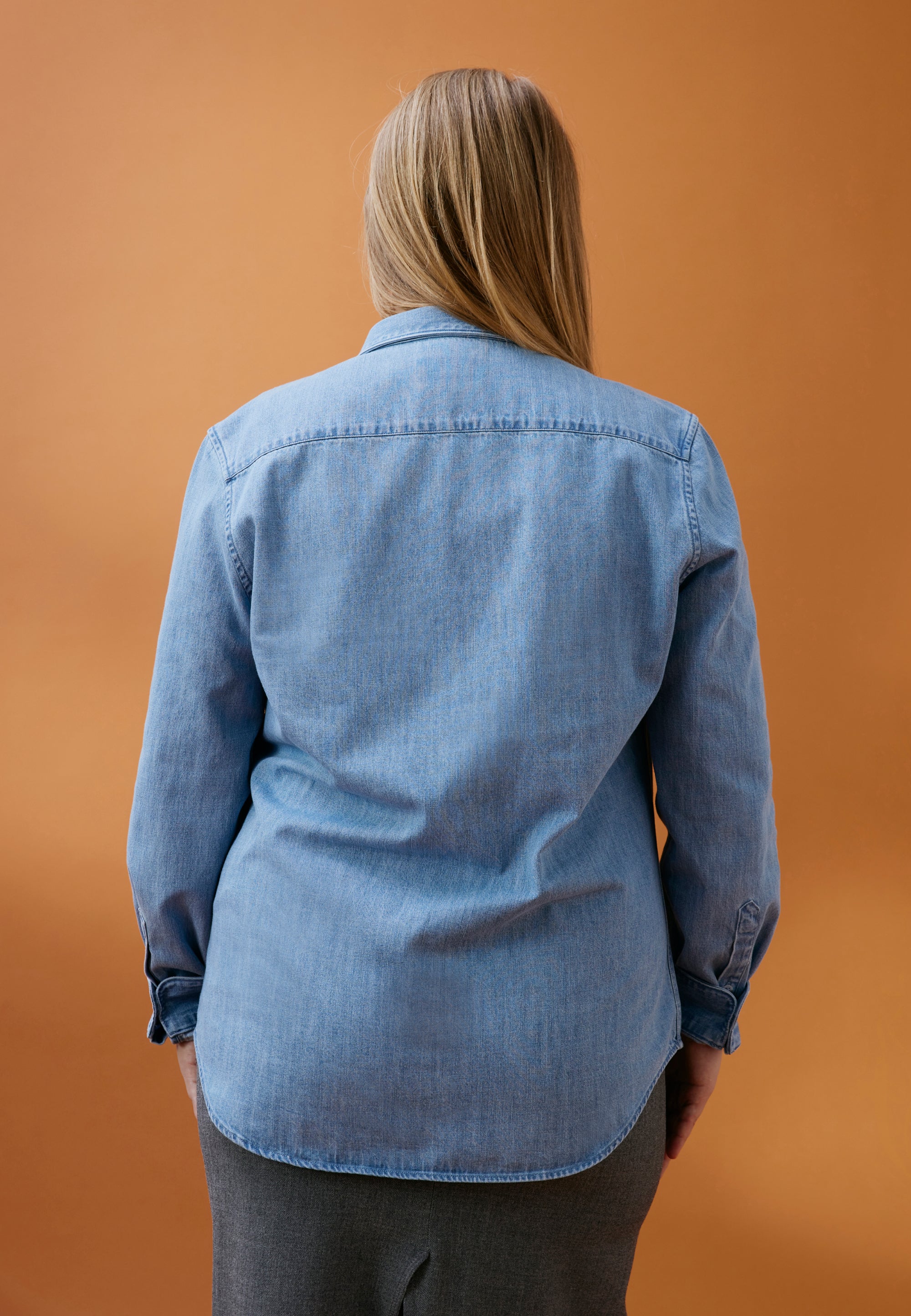 Cette chemise va super bien vieillir - c’est ce qu’il y a de génial avec le denim de qualité, ça patine avec le temps. Et on en est d’autant plus sûr qu’on a le recul de la version homme (fabriquée avec le même tissu). Comme n'importe quelle chemise en denim, elle délavera avec les lavages, particulièrement sur les zones de frottement comme les coudes ou le col.