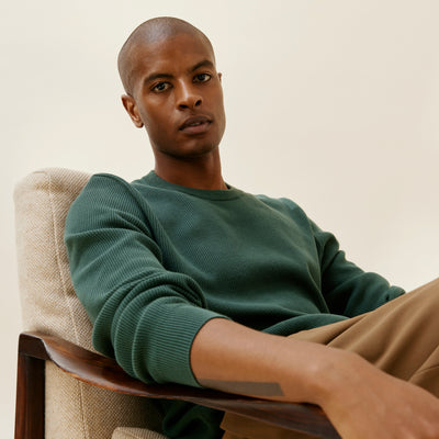 Par le passé, on a déjà fabriqué un pull texturé (un pull “point de riz” en laine) : il se vendait très bien mais il était un peu trop fragile à notre goût. Pour cette version, on passe à une texture plus robuste : le relief est en creux, ce qui réduit les risques d’accroc. Et on remplace la laine par du coton (bio) : aucun risque de trous aux coudes, de bouloches, de rétrécissement au lavage.