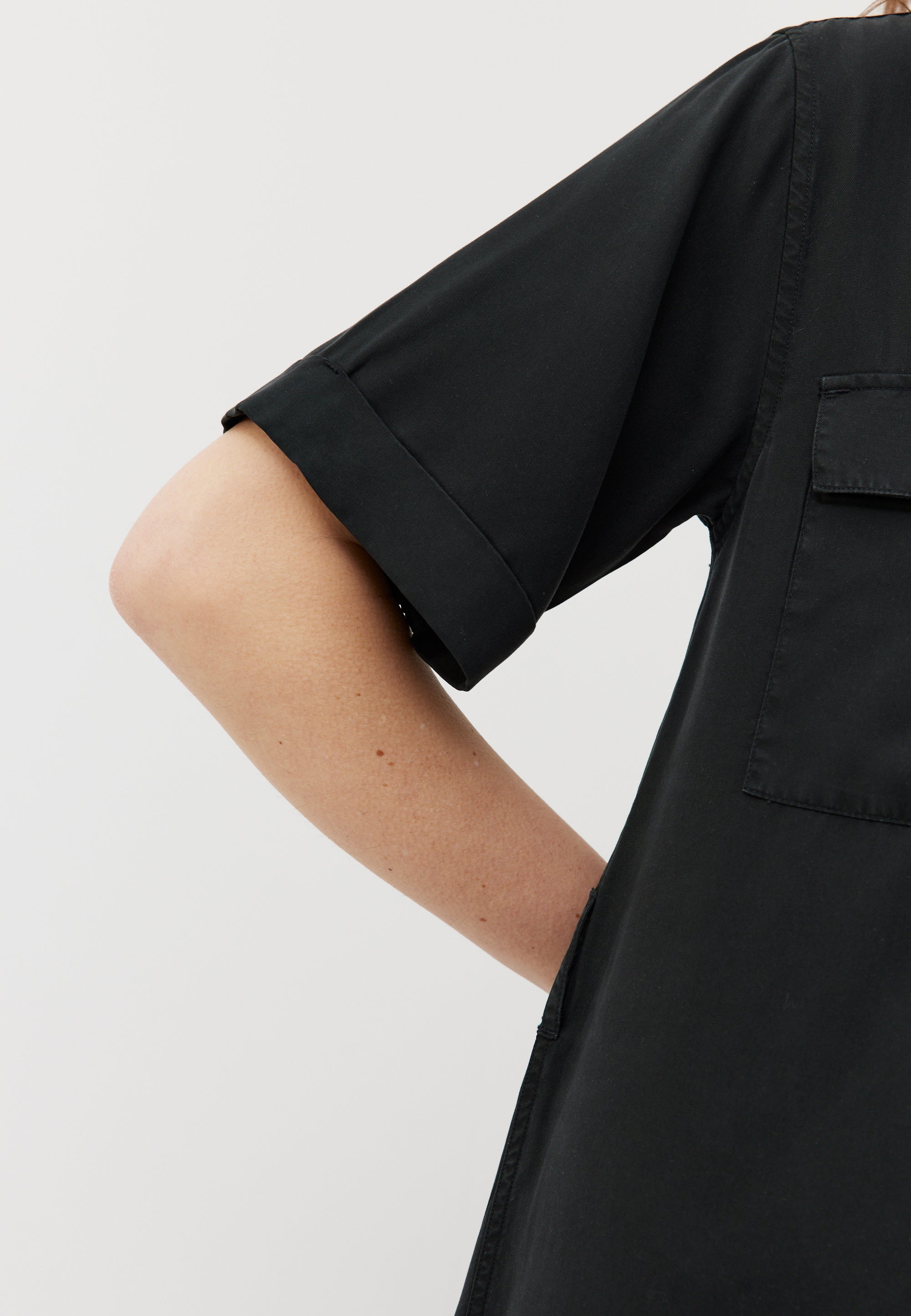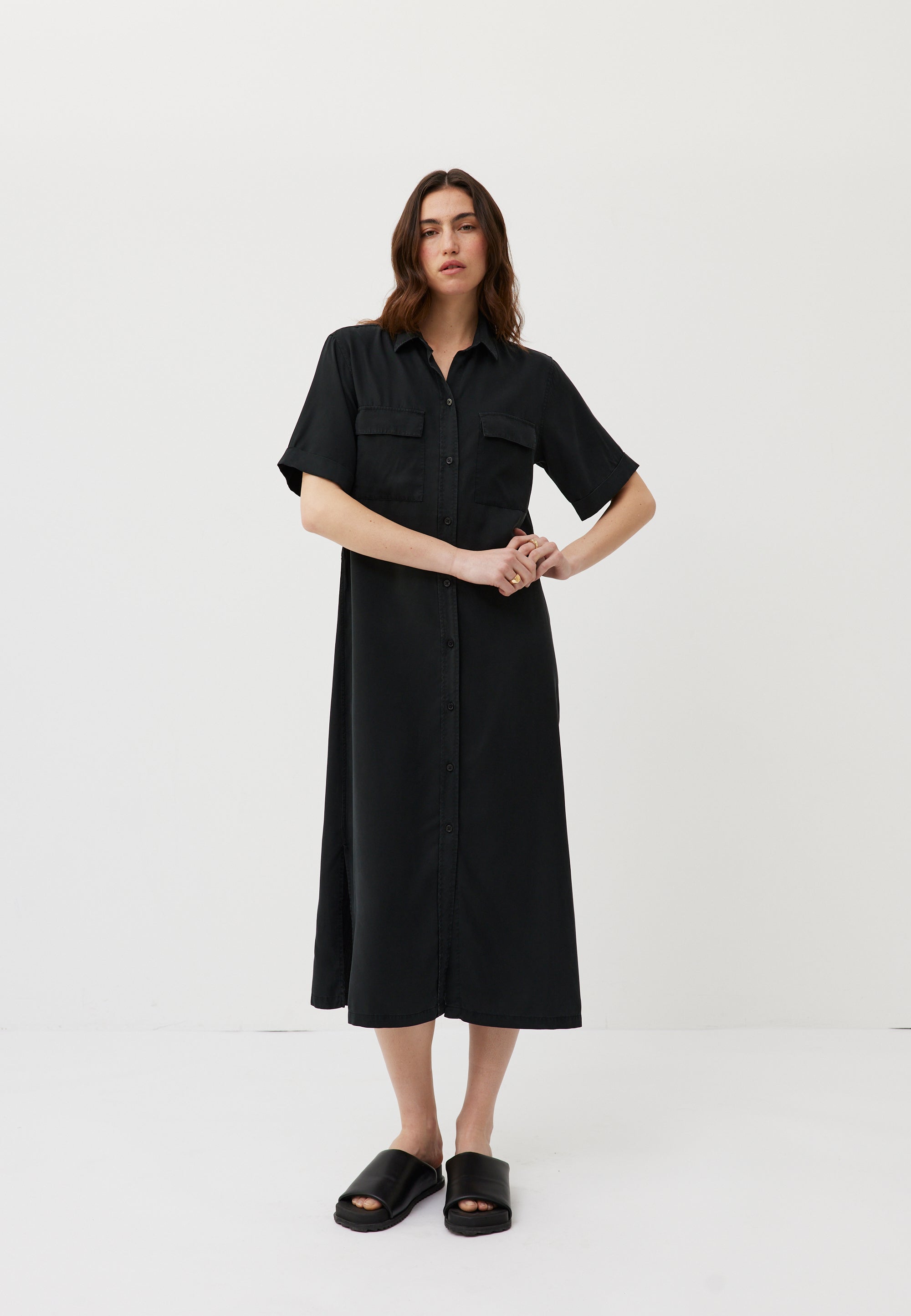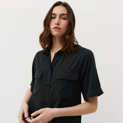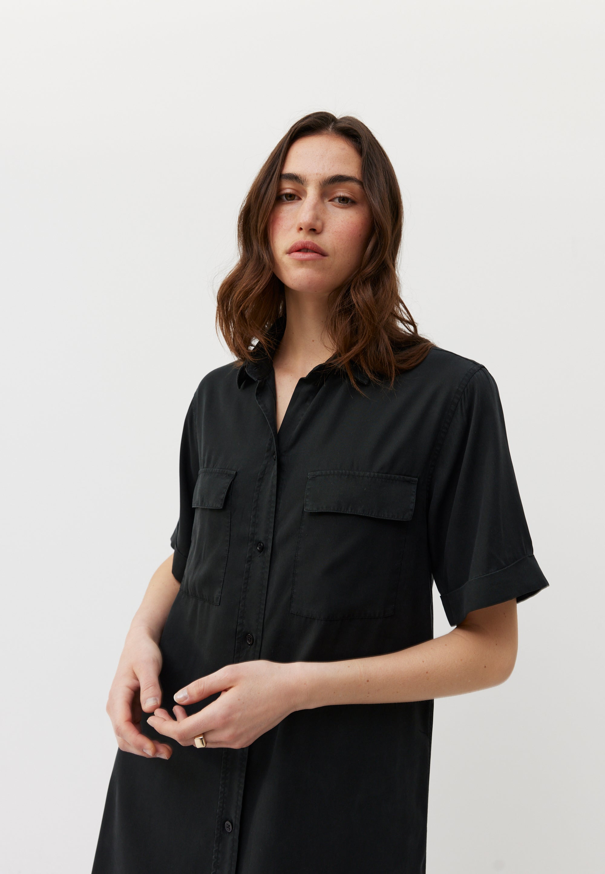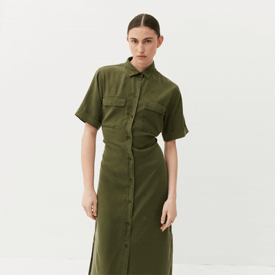 Une robe chemise qui vous tiendra au frais même s’il fait (de plus en plus) chaud : coupe droite, manches courtes, fentes sur le côté et tissu Tencel au toucher frais qui évacue la transpiration. Cette matière, faite à partir de pulpe de bois, ressemble à de la soie (mais en plus solide) : elle est douce sur la peau et crée un joli drapé quand vous bougez. Enfin, on a joué avec les codes du workwear : boutonnière visible, poches à rabat et couleur un peu patinée pour un aspect décontracté.