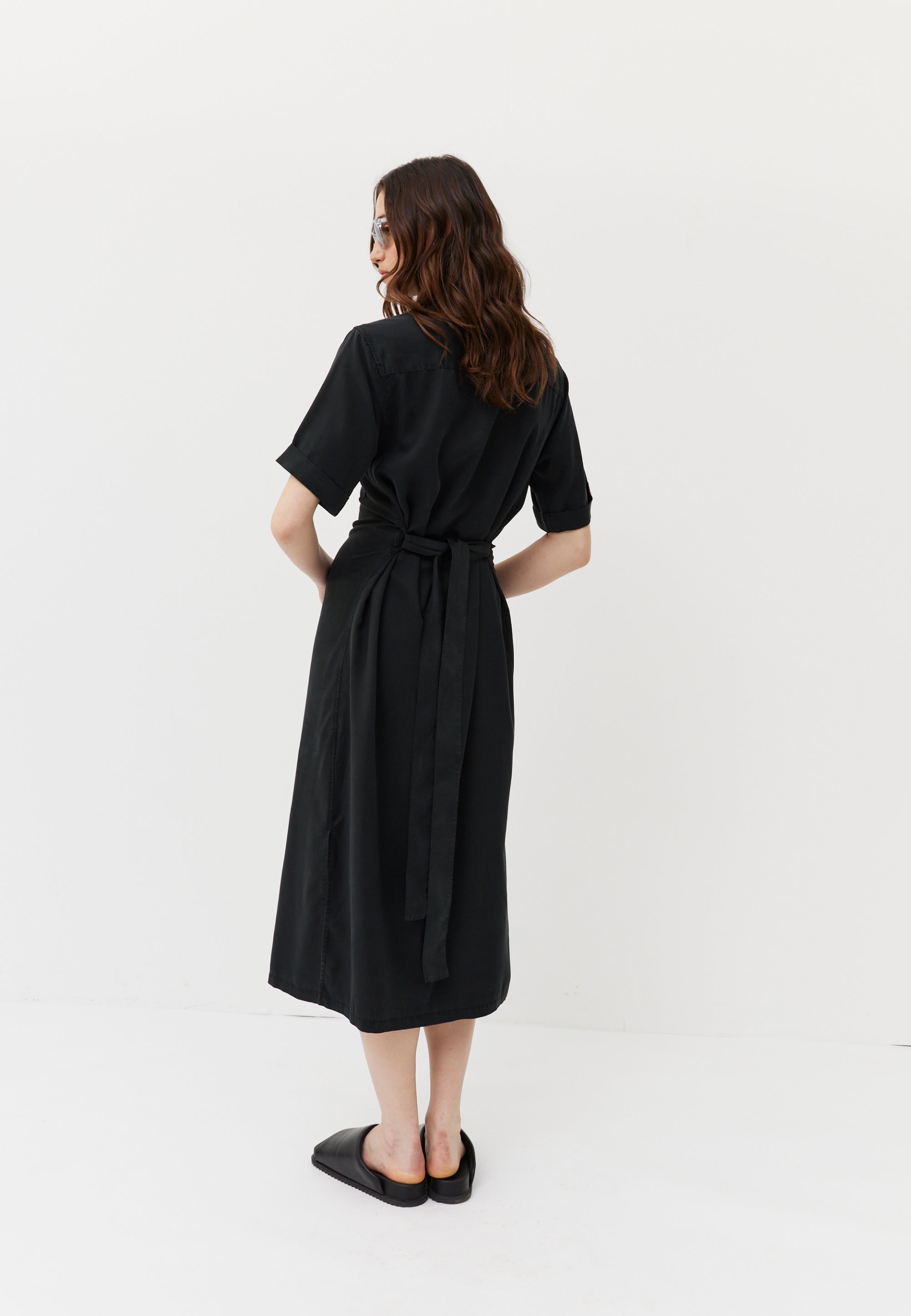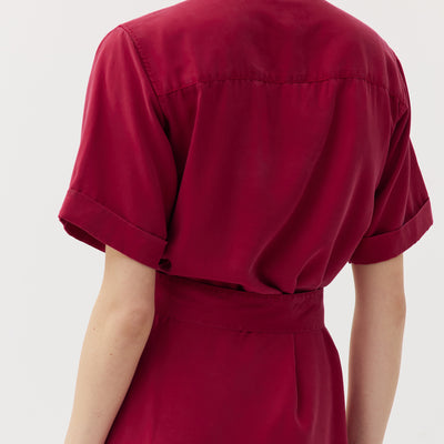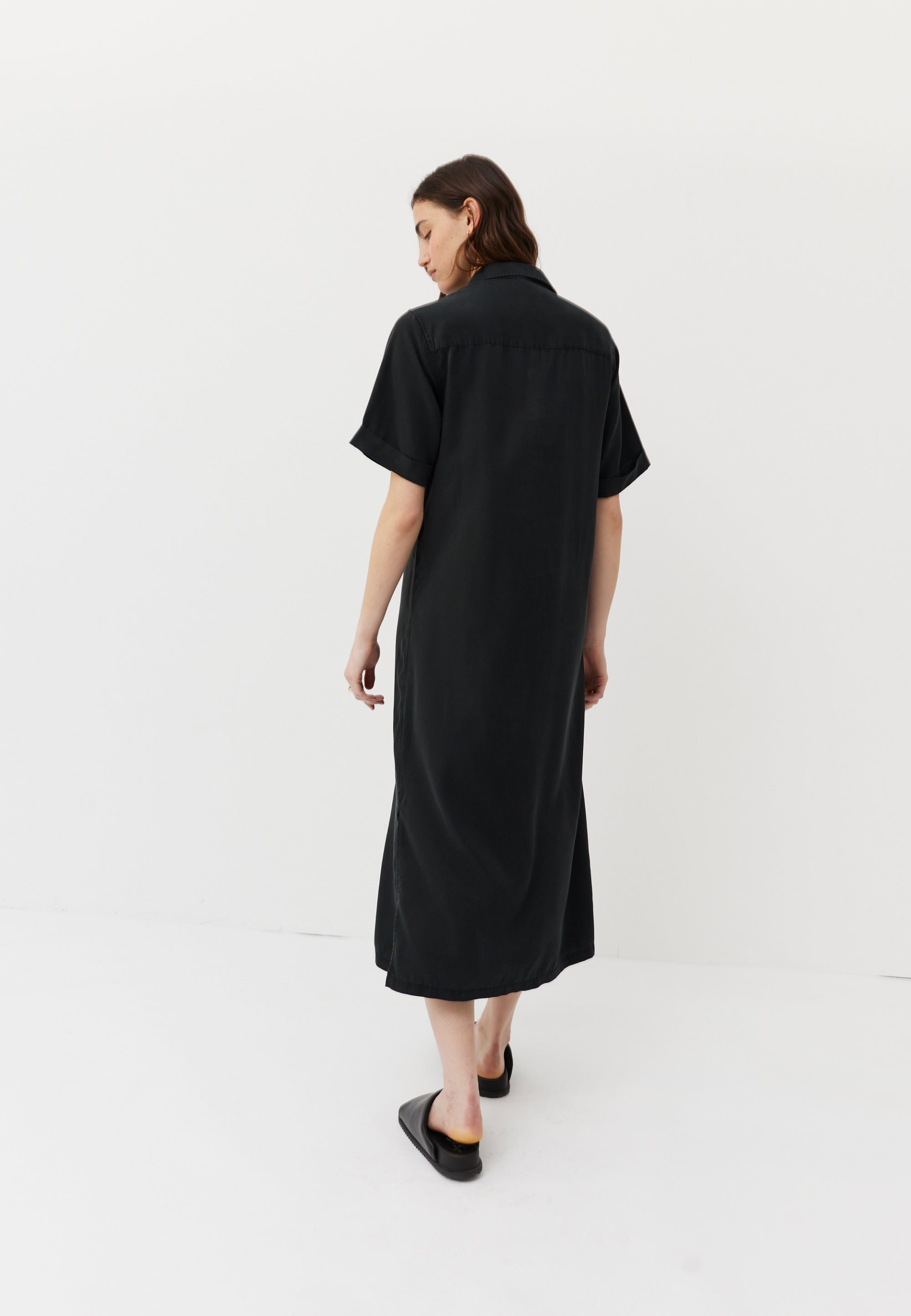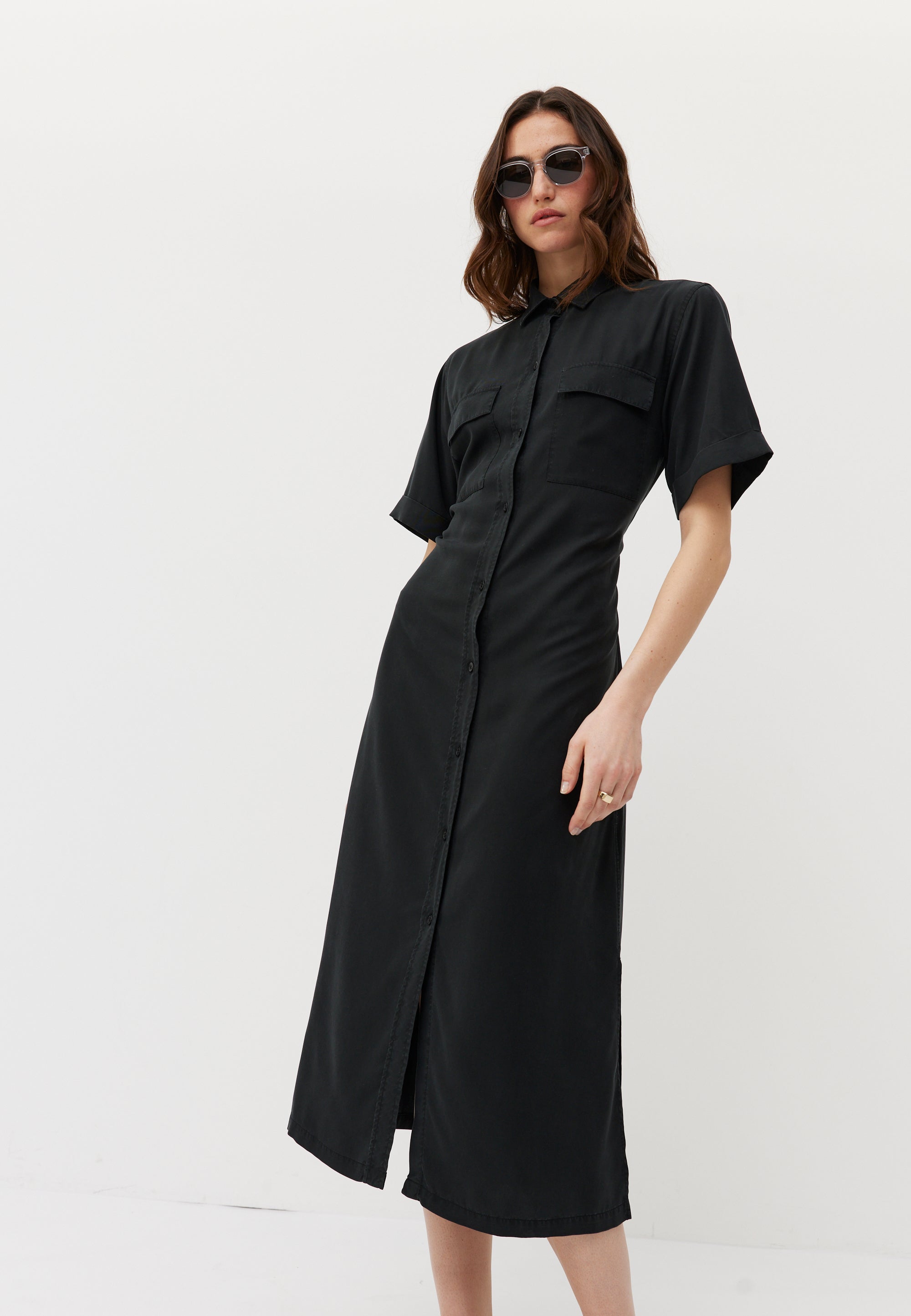 Une robe chemise qui vous tiendra au frais même s’il fait (de plus en plus) chaud : coupe droite, manches courtes, fentes sur le côté et tissu Tencel au toucher frais qui évacue la transpiration. Cette matière, faite à partir de pulpe de bois, ressemble à de la soie (mais en plus solide) : elle est douce sur la peau et crée un joli drapé quand vous bougez. Enfin, on a joué avec les codes du workwear : boutonnière visible, poches à rabat et couleur un peu patinée pour un aspect décontracté.