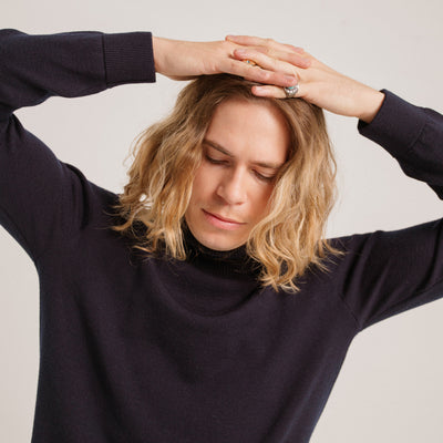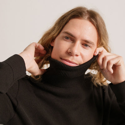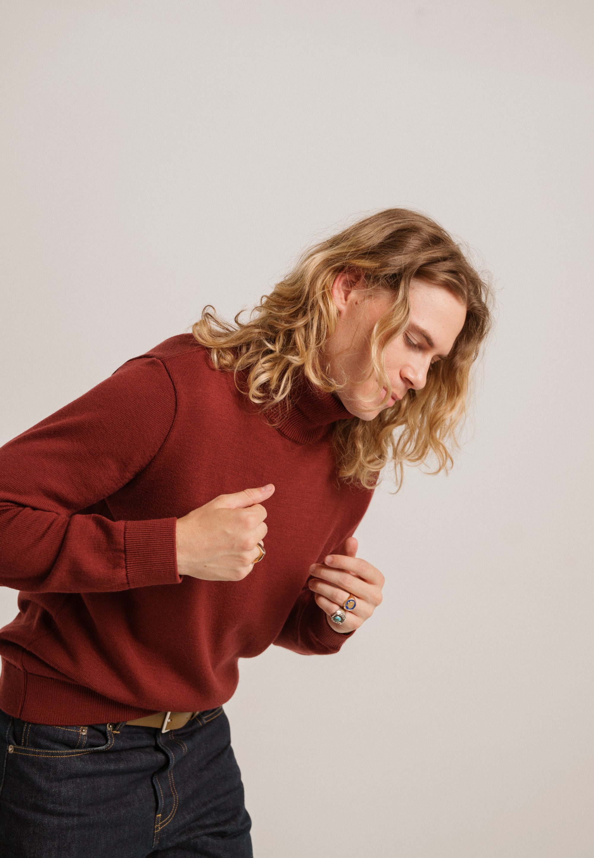 Le col roulé a deux missions : tenir chaud, rendre beau. Tenir chaud, oui, mais à condition de ne pas gratter – pas de risque ici, on a utilisé de la laine mérinos extrafine. Rendre beau, oui, mais à condition qu’il soit bien taillé : on a choisi un tricotage en ”panneaux diminués" avec un assemblage cousu pour qu’il tombe bien et que les coutures tiennent dans le temps.