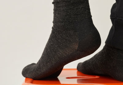 Pour éviter les trous à la pointe et au talon, les chaussettes sont habituellement renforcées avec du nylon. Nous, on a choisi du cordura, un type de nylon particulièrement résistant à l'abrasion, notamment utilisé pour les vêtements militaires. Et on a aussi renforcé la semelle et le tendon d’achille. Mais uniquement sur l’extérieur pour que la peau reste en contact avec la laine : c’est plus doux et ça évite de (trop) transpirer.