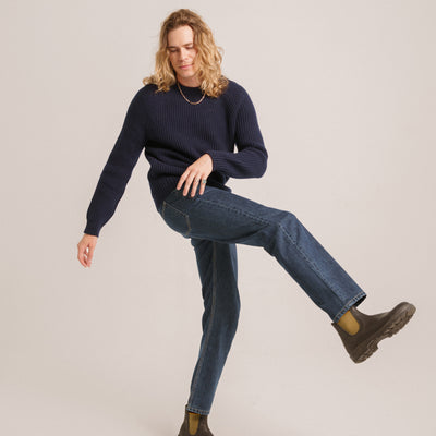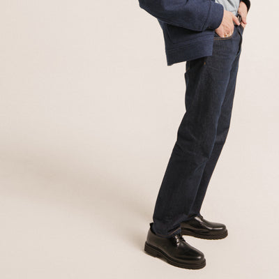 Pas de coloris “bleach” ici, car un délavage industriel trop fort peut affaiblir la fibre. On vous laisse le choix entre un brut (qui a été lavé juste une fois pour le pré-rétrécir) et un bleu stone. Et si vous rêvez d’une couleur plus claire, il faudra simplement… attendre quelques années : la teinture indigo va s’estomper avec les portés et les machines, pour lui donner un délavage unique*.