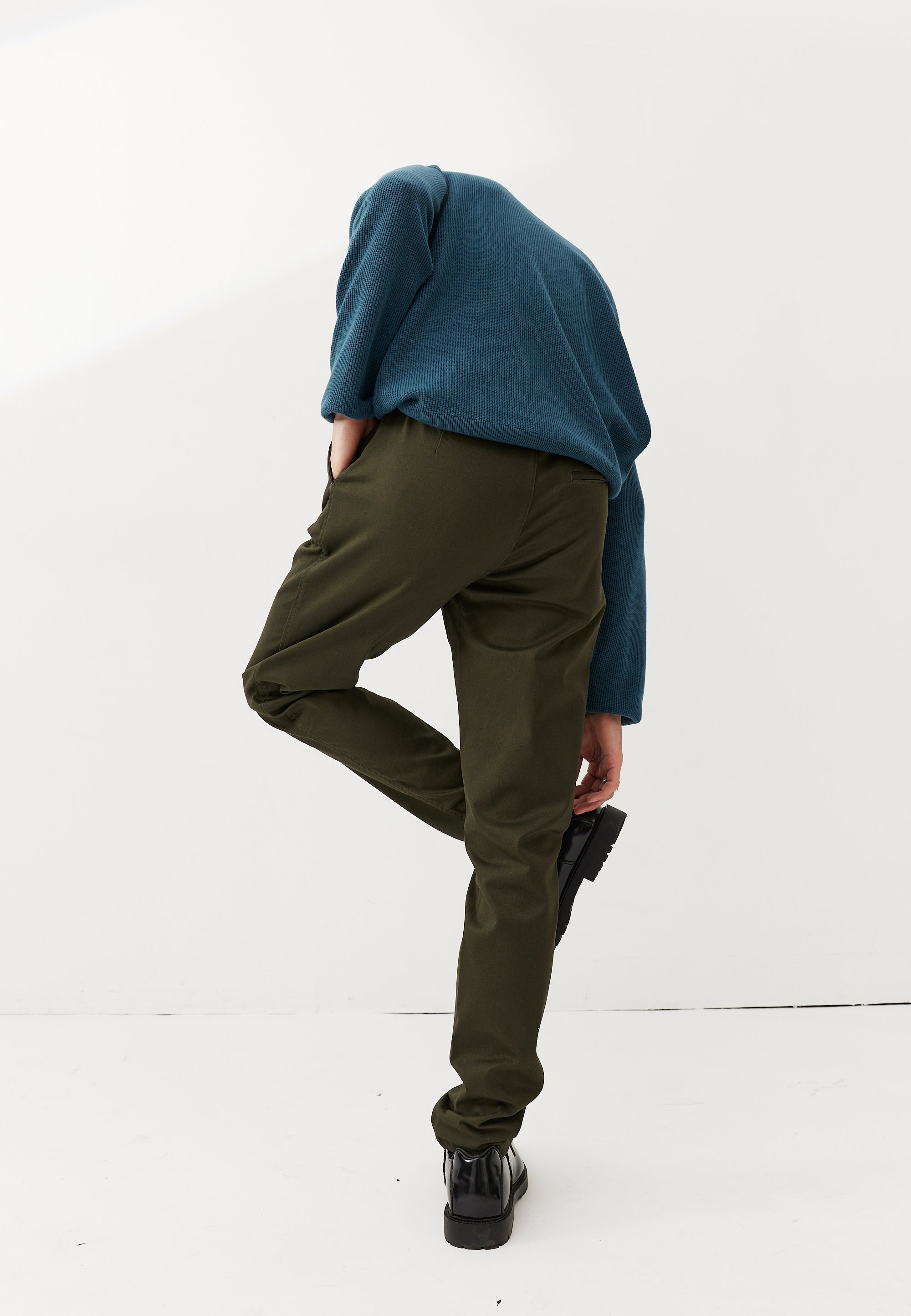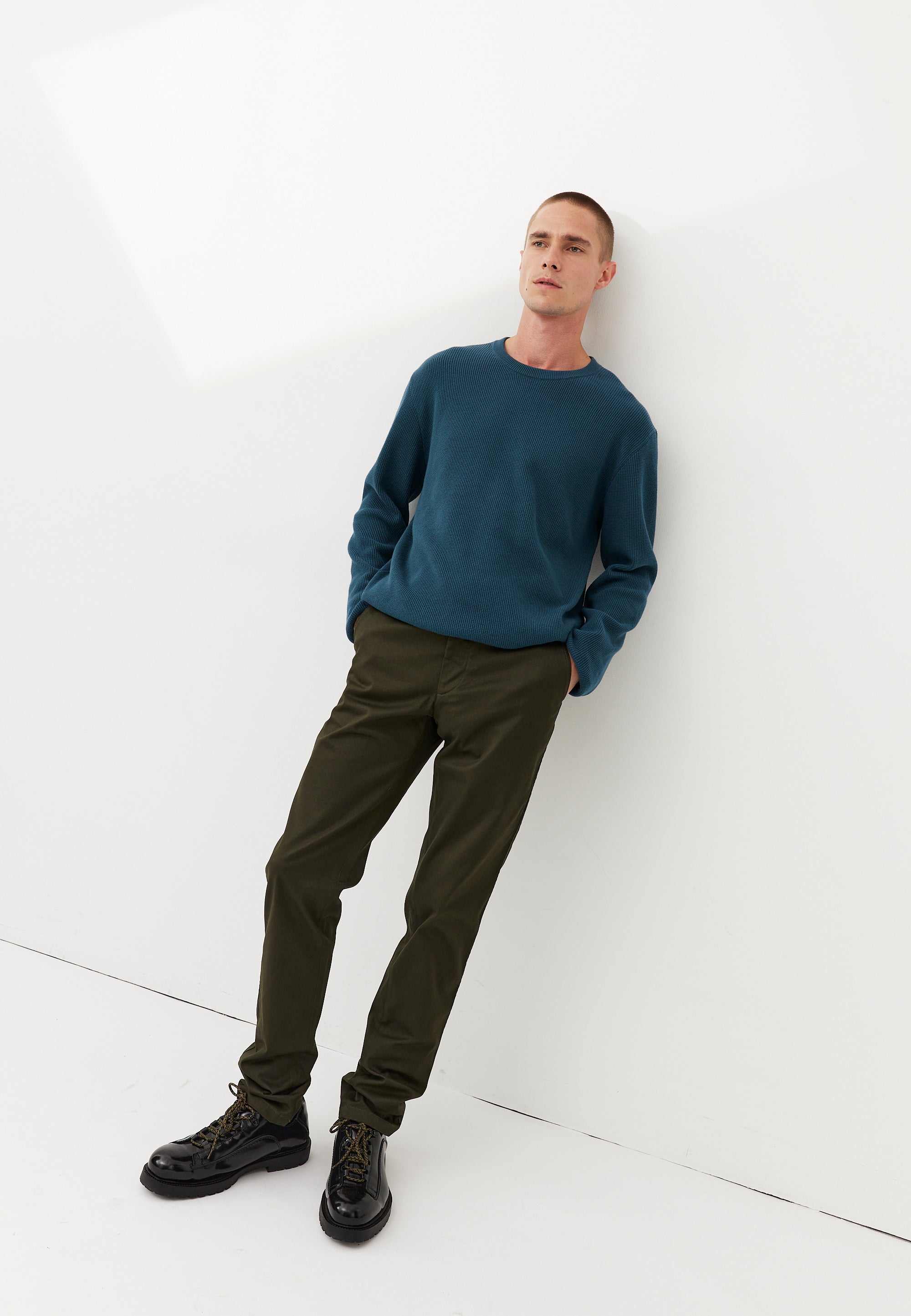 Le deuxième souci des chinos, c’est qu’ils se détendent. Notre tissu contient un fil d’élastomultiester : grâce à cette matière, il retrouve sa forme après avoir été détendu. Même après plusieurs années, vous ne verrez pas de “poches” apparaître au niveau des genoux.