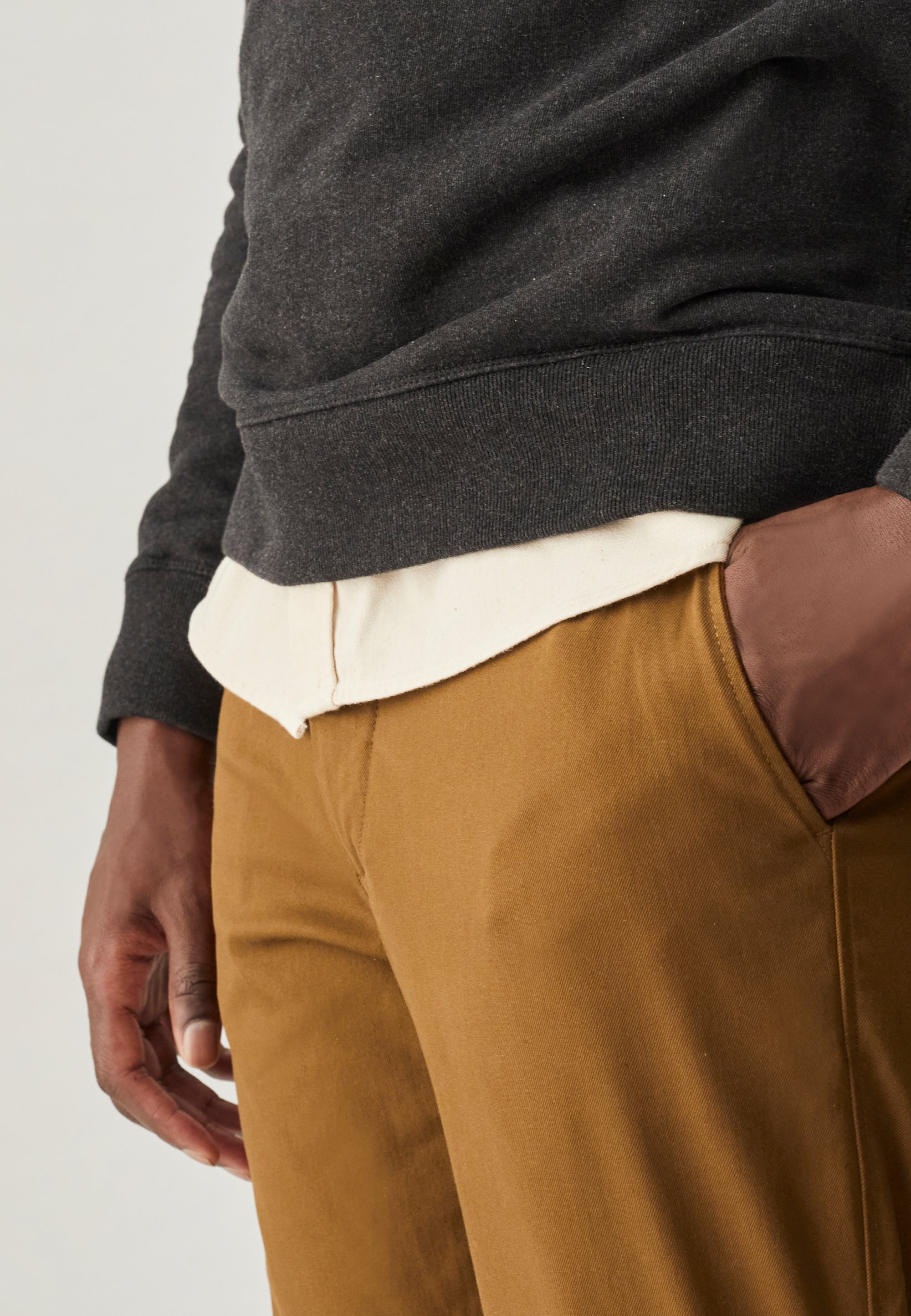 Notre priorité, c’était de résoudre LE problème des chinos : la décoloration. Et on a réussi : sa couleur tient mieux que tous ceux qu’on a testés (cf. les photos de nos tests sur ce lien). Parce que 1) on a teint le tissu, pas le chino 2) on a fixé la teinture à très haute température et 3) on a mercerisé le tissu pour que les fibres gonflent et que la teinture rentre mieux. Bien sûr, la couleur se patinera quand même au fil des années mais vos chinos resteront tout à fait portables.