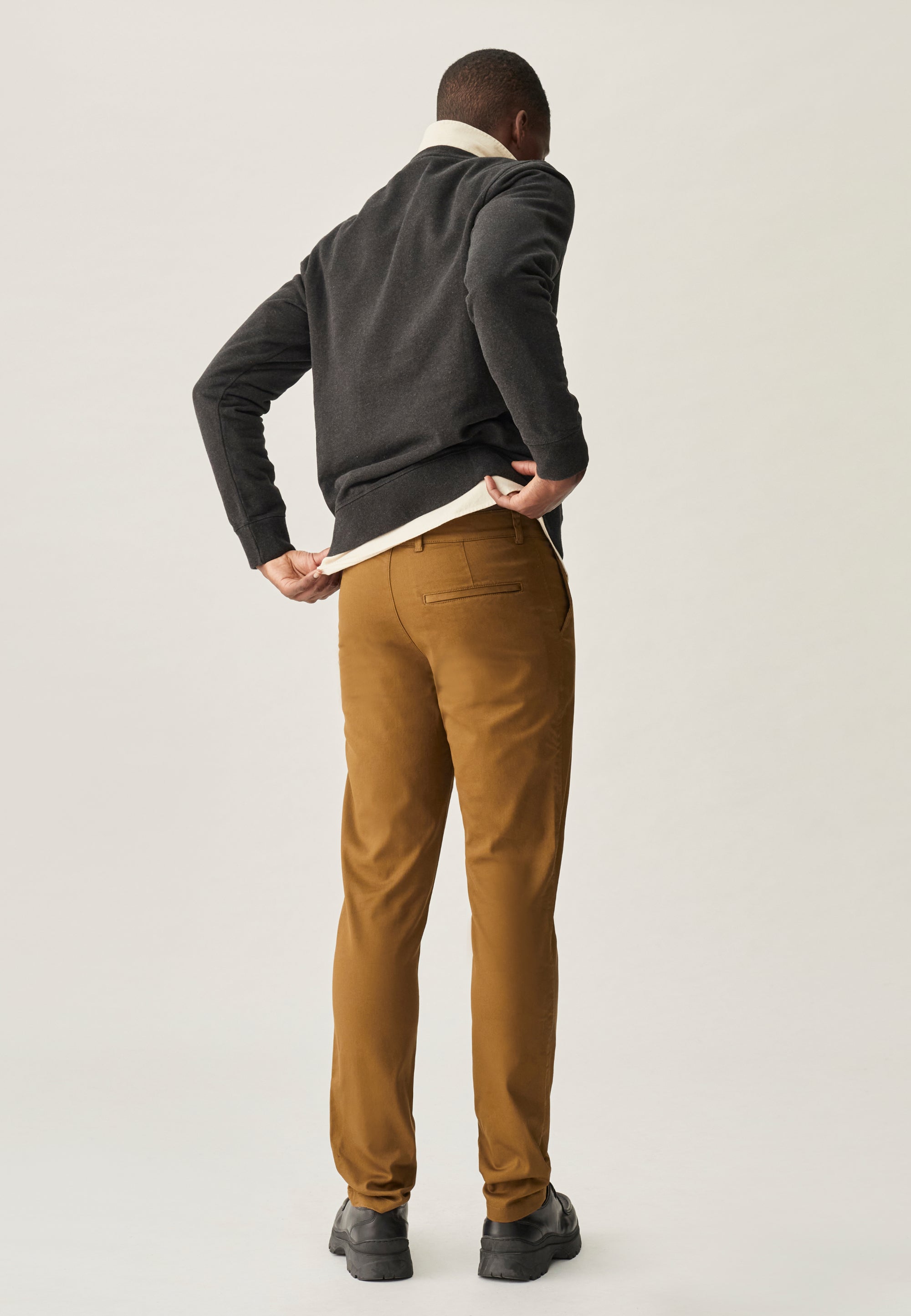 Le deuxième souci des chinos, c’est qu’ils se détendent. Notre tissu contient un fil d’élastomultiester : grâce à cette matière, il retrouve sa forme après avoir été détendu. Même après plusieurs années, vous ne verrez pas de “poches” apparaître au niveau des genoux.