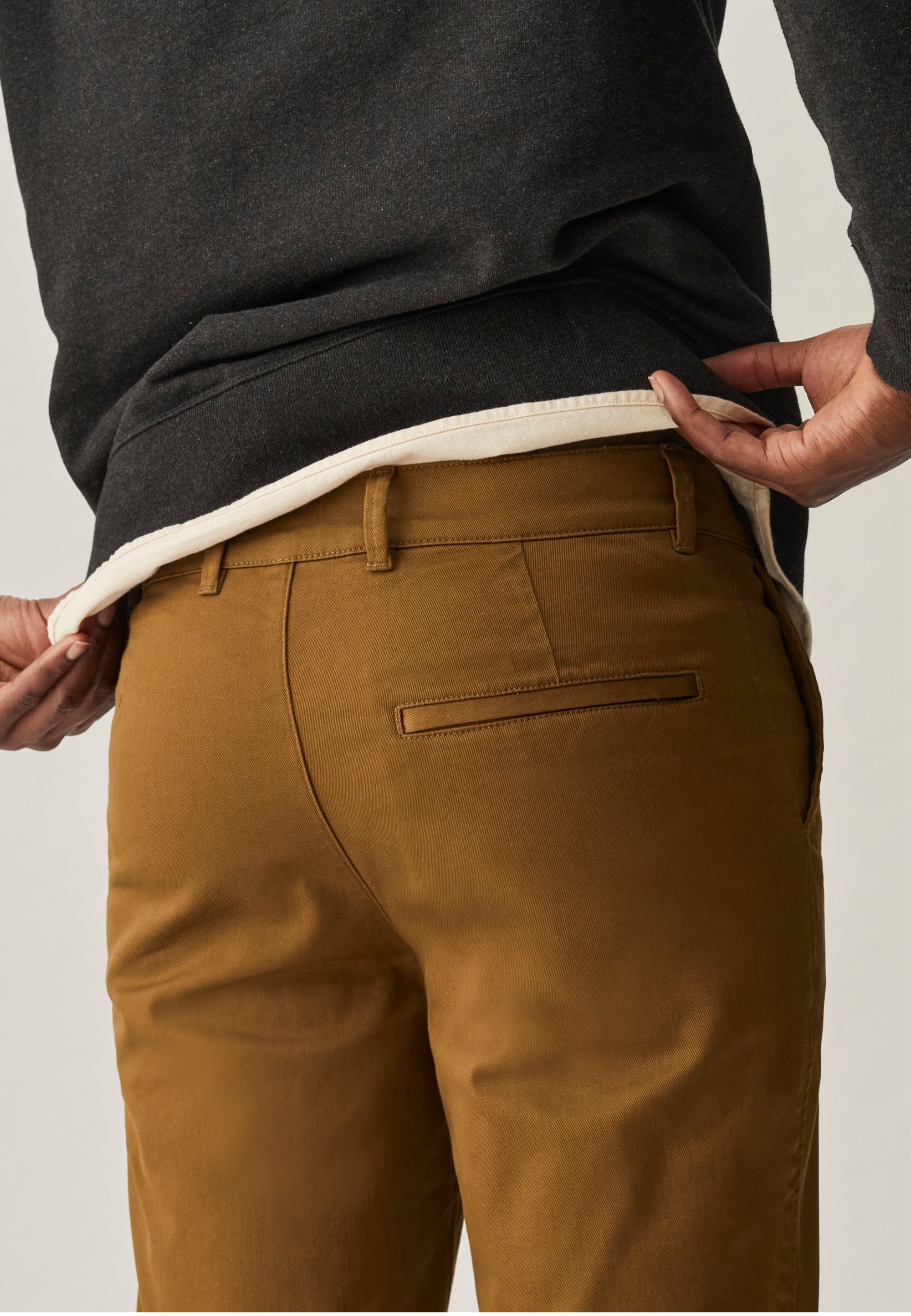 Avec ce tissu en coton teint dans les Vosges, on a réussi à limiter les problèmes habituels des chinos : notre pantalon décolore moins grâce à la "mercerisation" du coton, et se déforme peu grâce à l'ajout d'un fil "Lycra T400". Mais il a aussi du style : les couleurs sont profondes, et sa coupe semi-slim est le fruit d’années d’ajustements avec nos clients. Quelle que soit votre morphologie, on est à peu près sûrs qu’il vous fera de belles jambes.