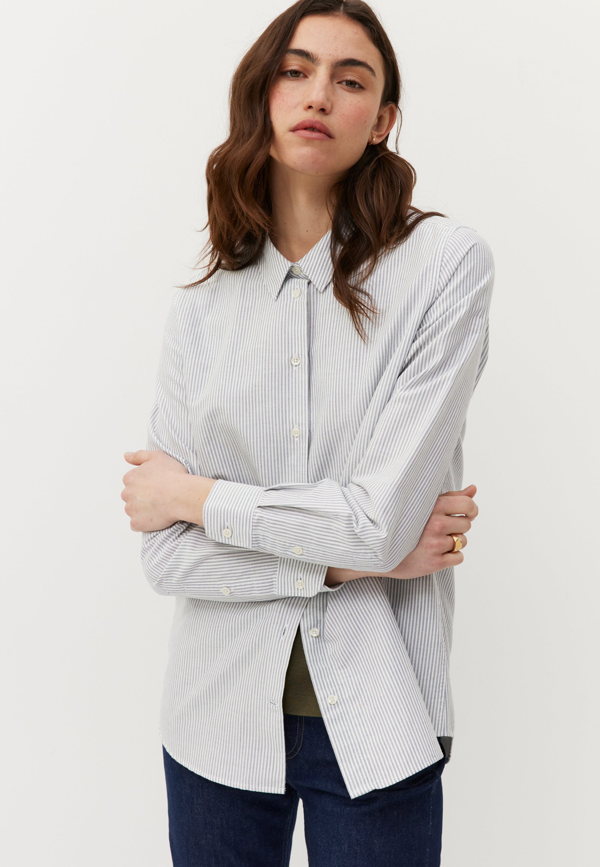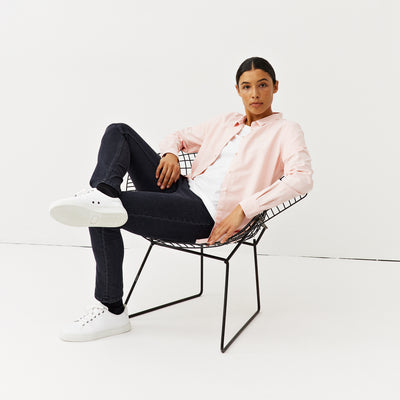 Cette chemise est en "oxford", un tissu naturellement résistant car les fils ont été doublés. En plus, ça lui donne un léger relief – votre peau respirera et vos yeux apprécieront. Autre avantage : le blanc restera opaque en toute circonstance (sauf si vous vous jetez à l'eau). La coupe est légèrement ajustée, avec un peu d'aisance au niveau de la poitrine. Tout ça 100% coton bio et made in Portugal.