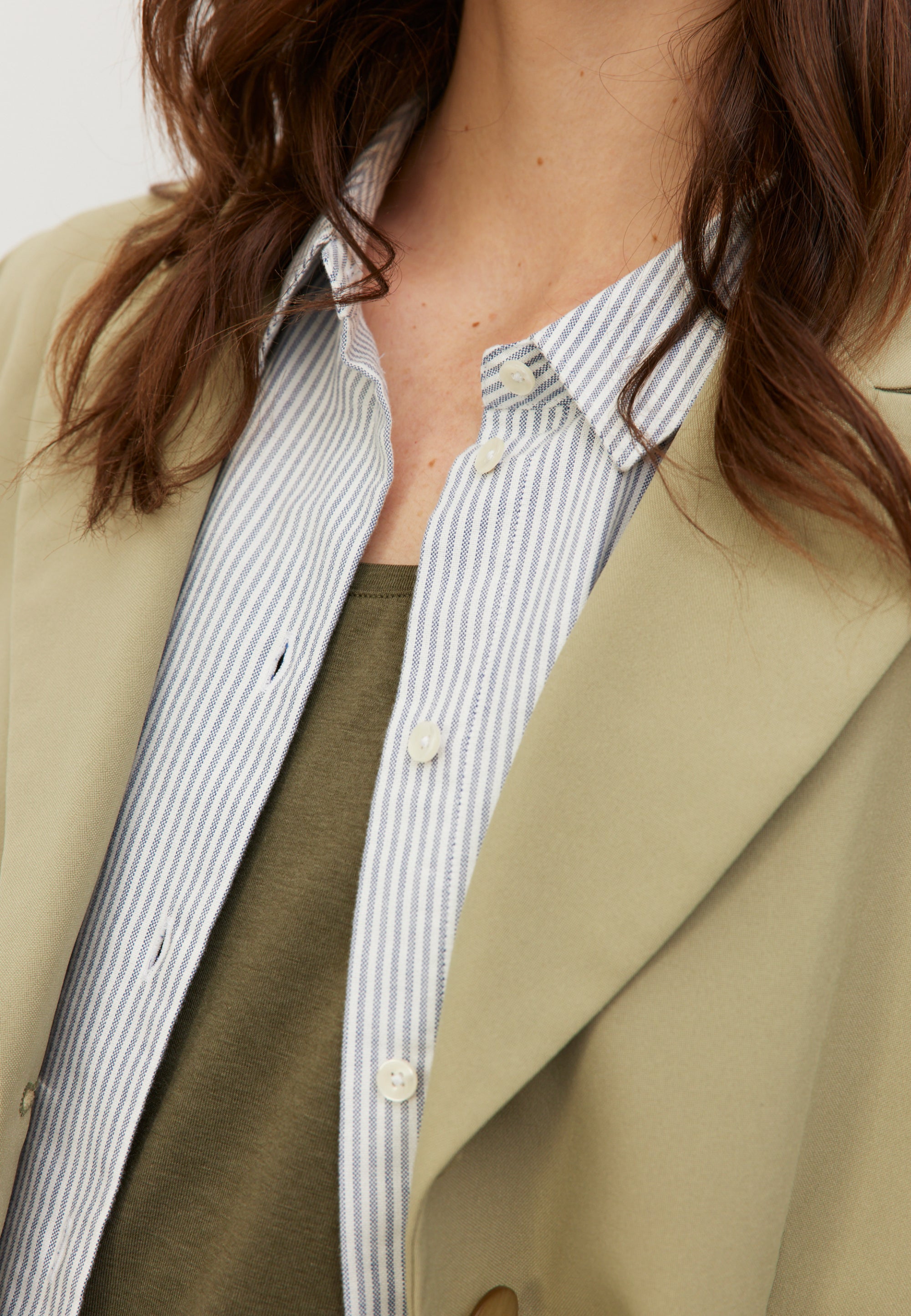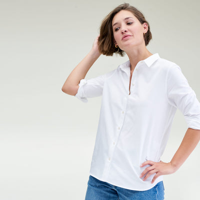 Ne pas être serrée à la poitrine, c’est LA chose que vous attendiez de cette chemise. On a donc travaillé une coupe qui vous laisse de la place à cet endroit sans être oversize, on a ajouté un pli creux dans le dos pour donner encore de l’aisance, et on a positionné les boutons pour faire en sorte que ça ne baille pas.