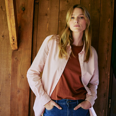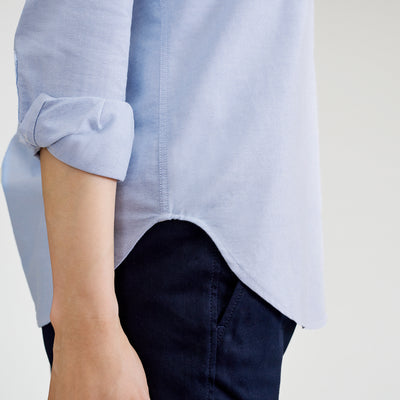 Le tissu oxford est une structure dite “nattée", avec deux fils verticaux et deux fils horizontaux. C’est, mécaniquement, la structure la plus solide qui existe. On l’a choisi en 150g/m2, comme pour notre modèle homme. Ça ne bougera pas et ça reste très confortable.