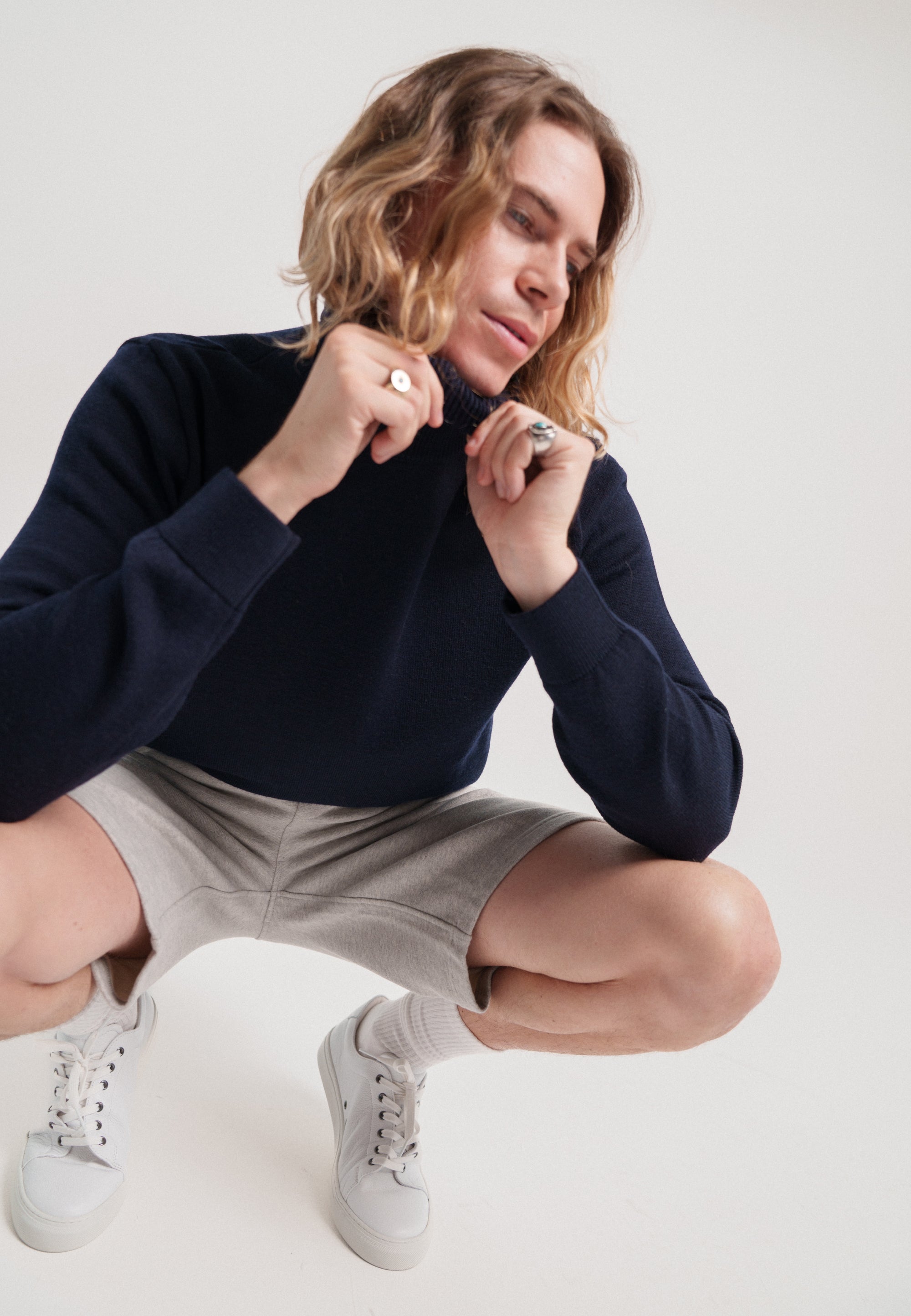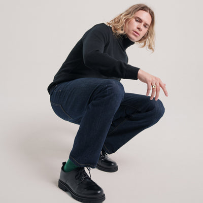 Le col roulé a deux missions : tenir chaud, rendre beau. Tenir chaud, oui, mais à condition de ne pas gratter – pas de risque ici, on a utilisé de la laine mérinos extrafine. Rendre beau, oui, mais à condition qu’il soit bien taillé : on a choisi un tricotage en ”panneaux diminués" avec un assemblage cousu pour qu’il tombe bien et que les coutures tiennent dans le temps.