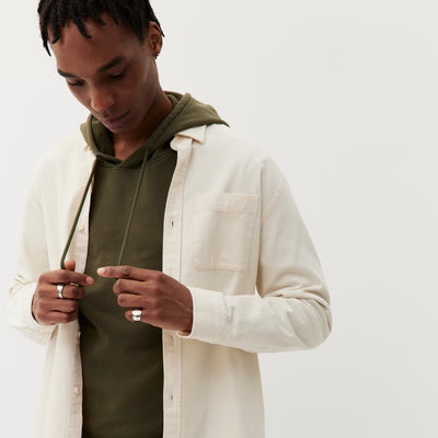Pour ce sweat à capuche, on a développé un tissu dense (420g/m2) et 100% coton bio pour qu’il garde une belle tenue – on a juste ajouté un fil d’élasthanne dans la ceinture et les poignets pour éviter qu’il se détende. Pour la coupe, on a opté pour une silhouette affûtée et sans poche kangourou sur le devant, qui finit toujours par se détendre avec le temps.