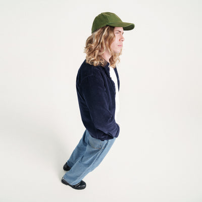 Tissée chez Manufacture Textile des Vosges, transformée en velours et teinte chez Velcorex (aussi dans les Vosges) puis confectionnée chez Marfel (près de Porto), cette surchemise est le produit d’une industrie locale. Et même si le coton utilisé vient de plus loin (difficile de faire autrement), on s’est assuré qu’il soit bio (certifié GOTS).