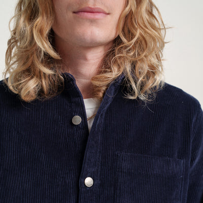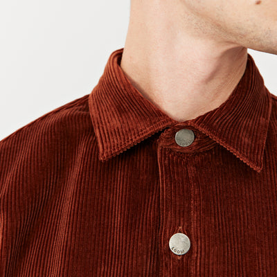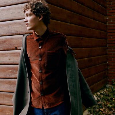 Cette surchemise est taillée dans un beau velours made in France à larges côtes. La matière est chaude, robuste, avec des reflets profonds. Une grande poche extérieure, une autre cachée à l’intérieur, des boutons en métal pour fermer le tout – on a pensé cette pièce pour qu’elle soit aussi pratique à porter qu’agréable à regarder.