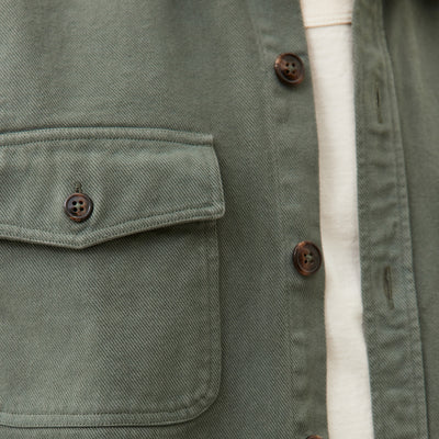 La base, c’est un tissu solide. Pour ça, on a été toquer à la porte de Telatex, une usine des Vosges née en 1840 qui fait (entre autres) du très beau workwear. On a trouvé un gros twill 3/1, un tissu particulièrement robuste dont l’armure dessine un motif en diagonale - comme pour les jeans - de densité 355g/m2. Et dans les détails aussi, on a pensé à sa longévité : points d’arrêt sur les coutures des poches, fixations des boutons renforcées avec la technologie Ascolite, poignets arrondis pour ralentir l’usure. Vous risquez de l’avoir sur le dos pour un bout de temps.