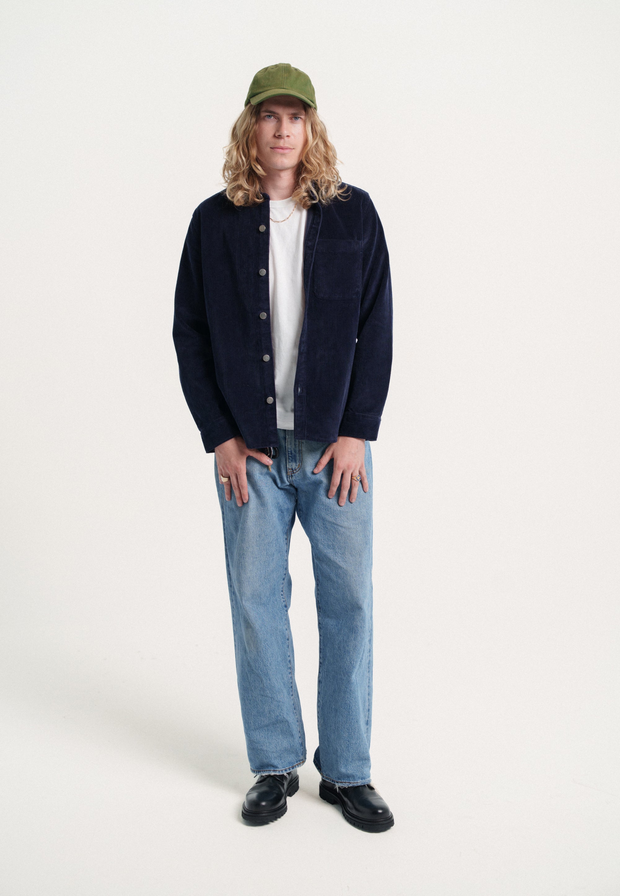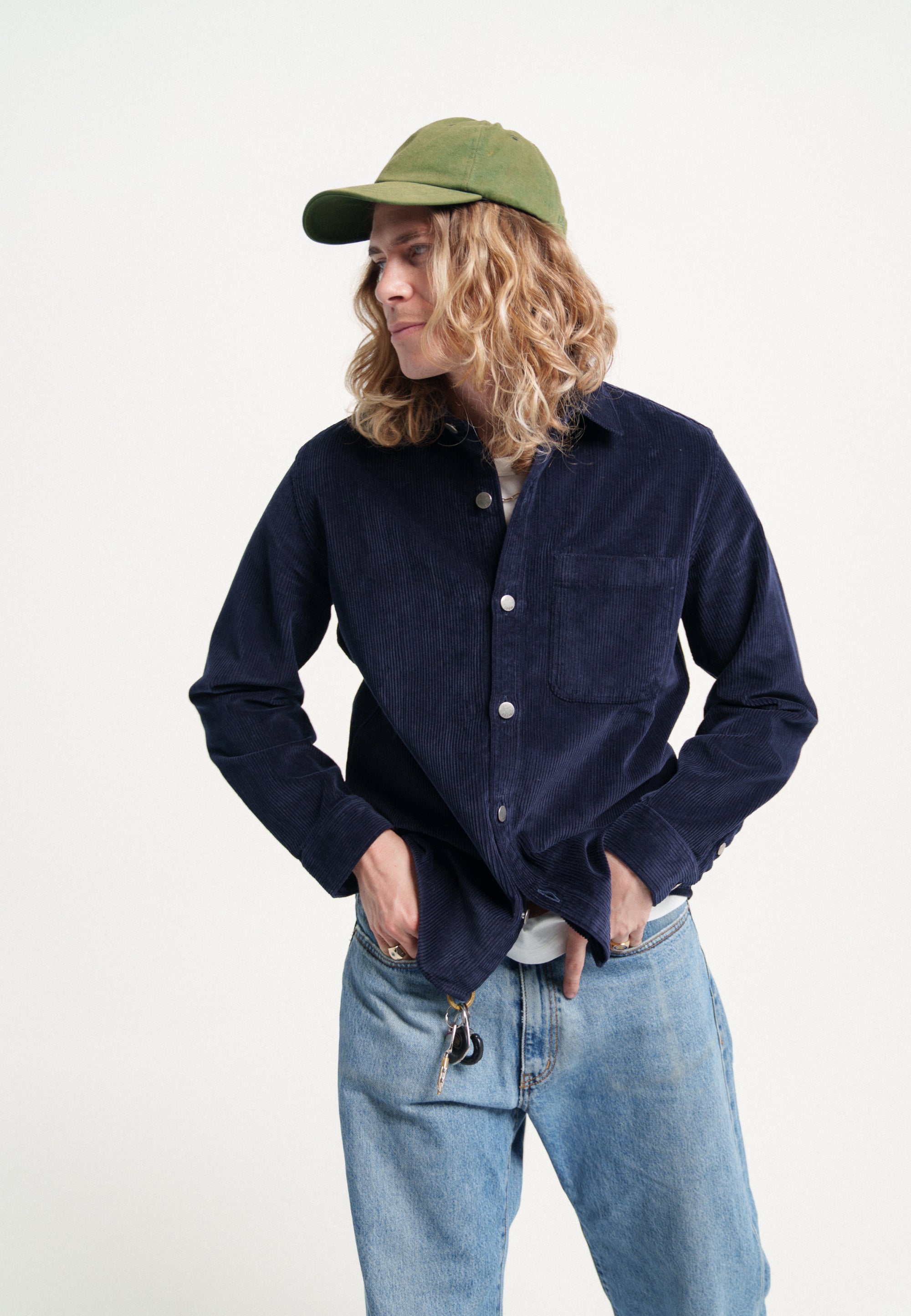 Cette surchemise est taillée dans un beau velours made in France à larges côtes. La matière est chaude, robuste, avec des reflets profonds. Une grande poche extérieure, une autre cachée à l’intérieur, des boutons en métal pour fermer le tout – on a pensé cette pièce pour qu’elle soit aussi pratique à porter qu’agréable à regarder.