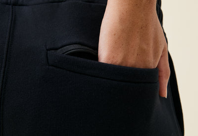 Nous avons dessiné ce jogging pour qu’il puisse être porté à la salle comme à la ville – en d’autres termes, pour qu’il soit confortable et stylé. Jambe pas trop serrée, taille élastiquée, cordon blanc contrasté… et notre petite touche en plus : un tissu qui se tient. On a développé une matière dense (330g/m2) en coton bio avec 10% de polyester pour éviter la déformation aux genoux. Bonus : une poche zippée à l'arrière, pour vos clefs ou votre CB.