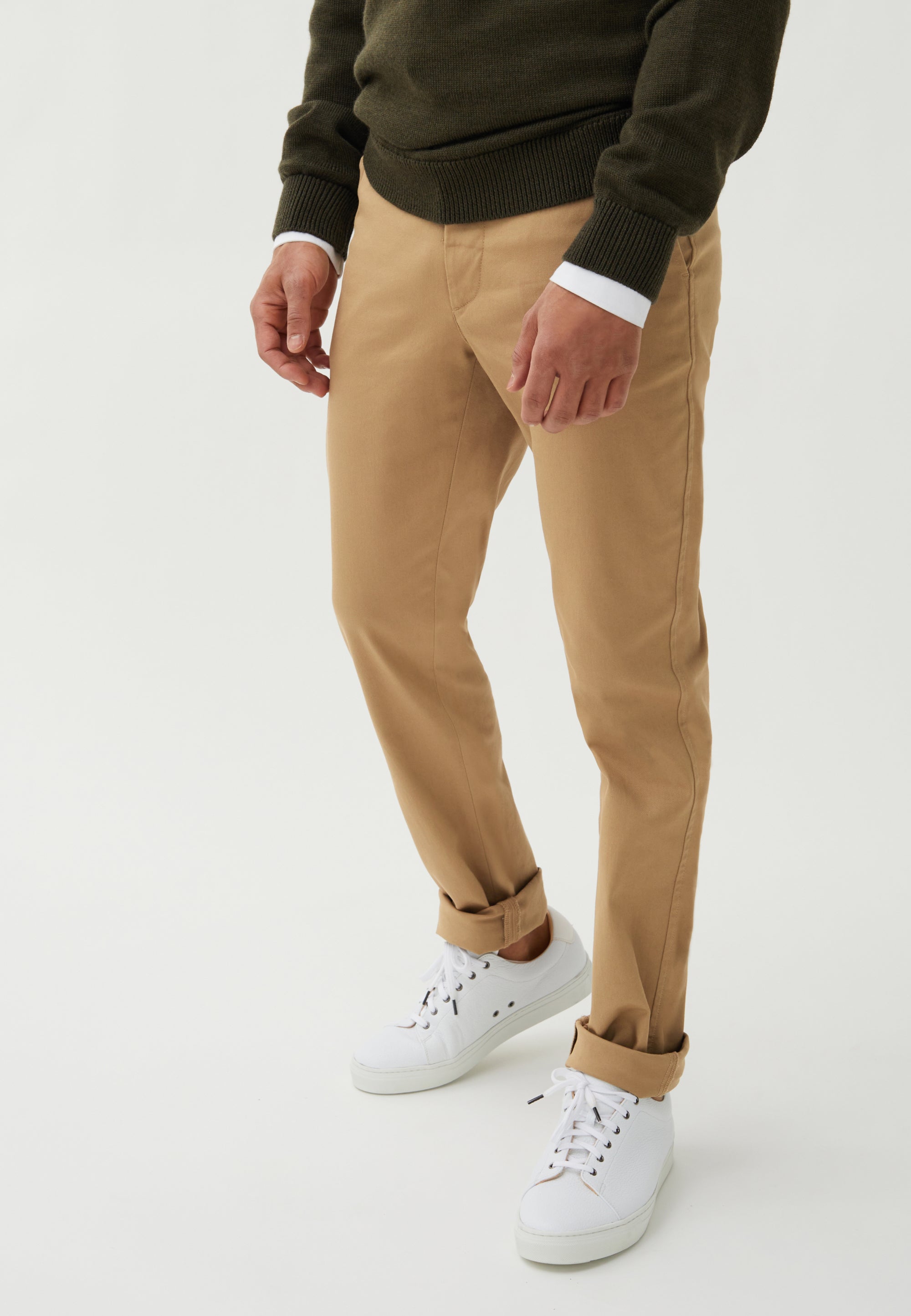 Le deuxième souci des chinos, c’est qu’ils se détendent. Notre tissu contient un fil d’élastomultiester : grâce à cette matière, il retrouve sa forme après avoir été détendu. Même après plusieurs années, vous ne verrez pas de “poches” apparaître au niveau des genoux.