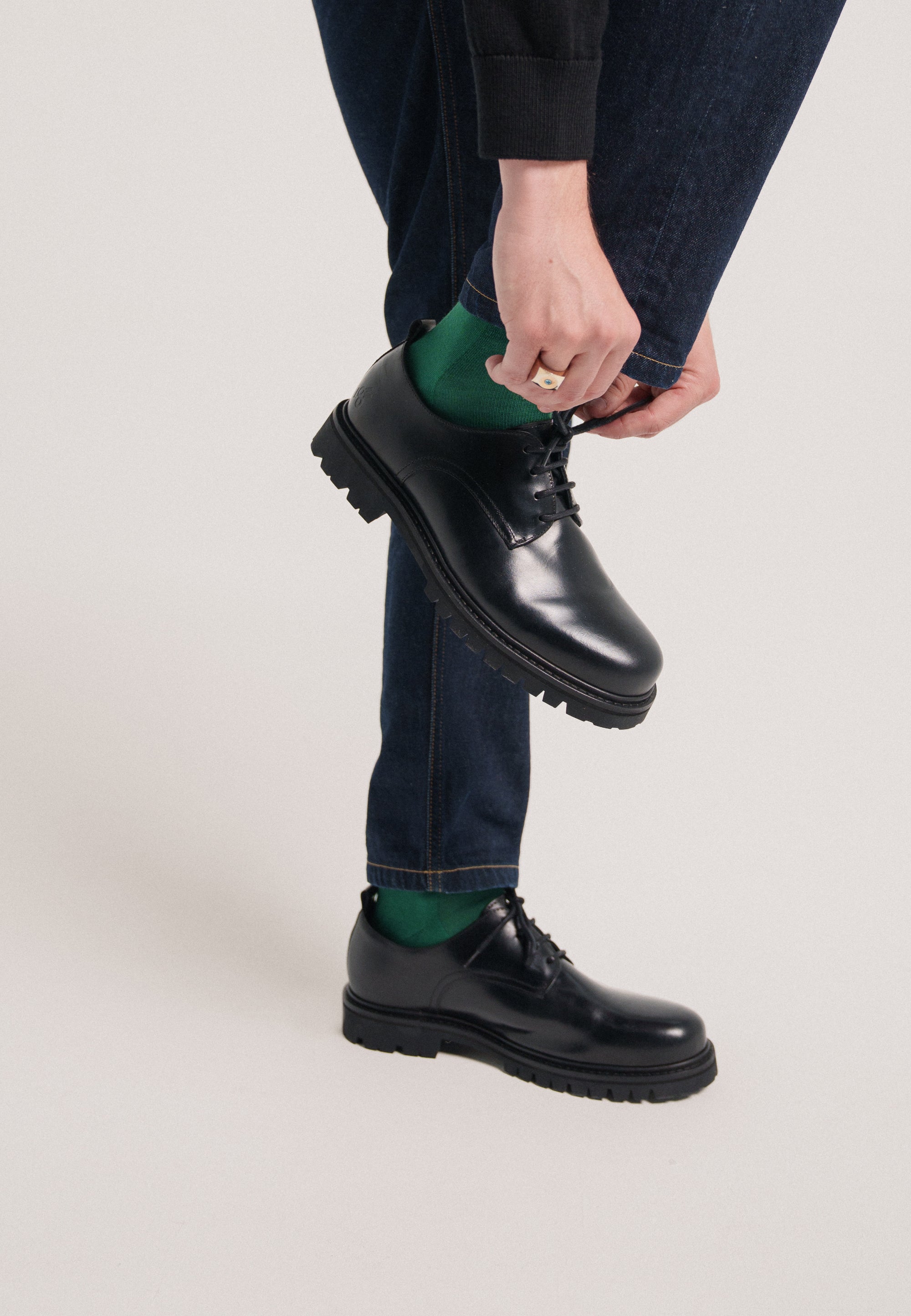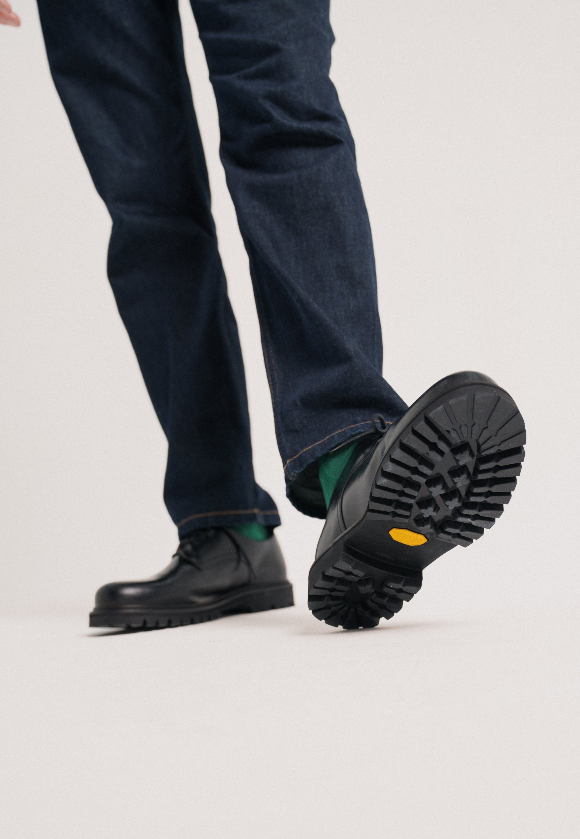 De belles chaussures qui ne sont pas prêtes de vous lâcher avec leur cuir pleine fleur et leur semelle Vibram ultra résistante. Pour leur donner un look moderne et pas guindé, on a opté pour un arrondi généreux à l’avant du pied et une semelle épaisse crantée. Des derbies faciles à porter au quotidien, aussi bien avec un jean qu’une tenue habillée.