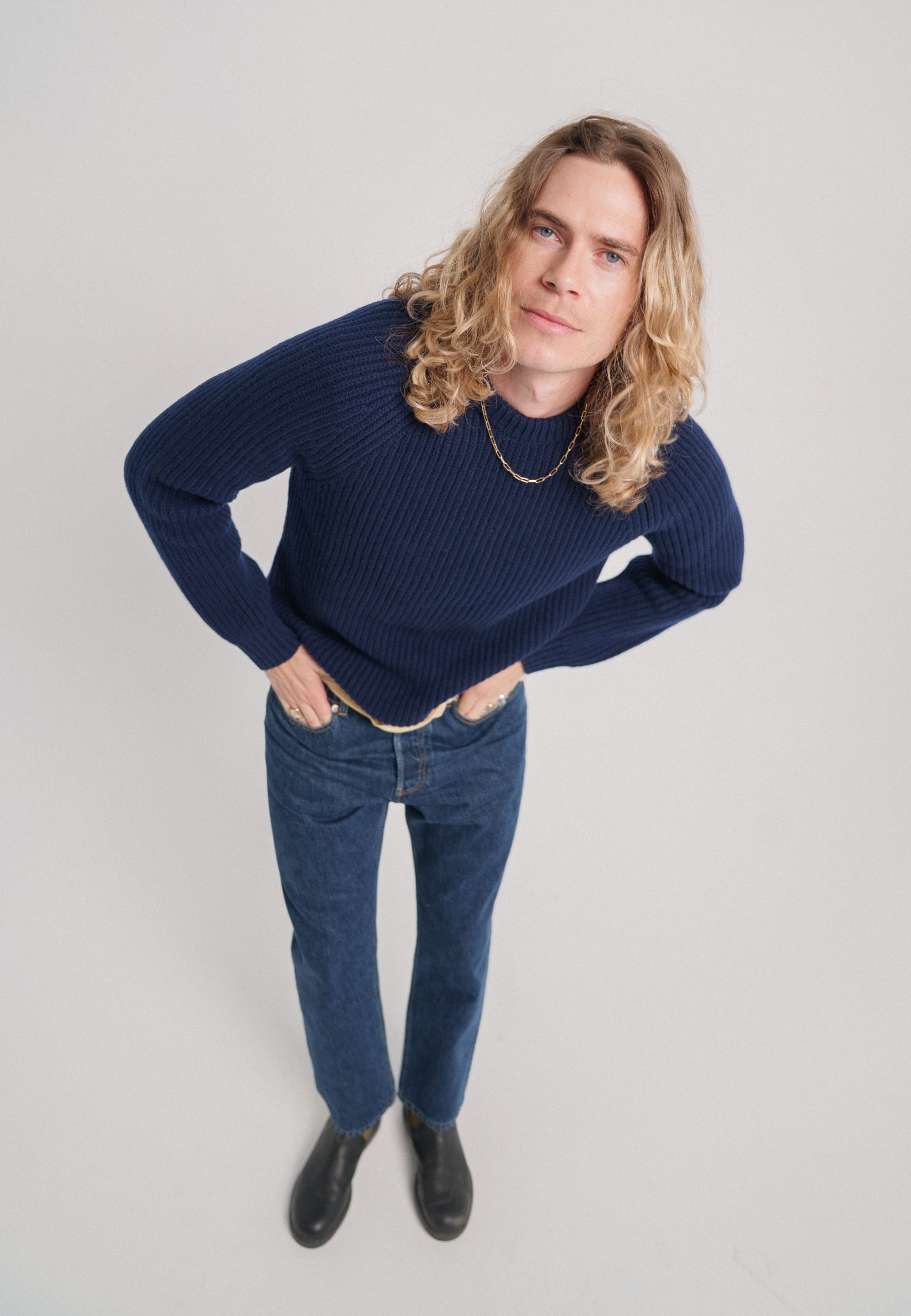 800 grammes de laine, un fil “cardé” (c’est-à-dire légèrement poilu) et un point de tricot fisherman : voilà un bon gros pull qui donne envie de partir en mer et d’affronter le grand froid. Mais il fonctionne aussi pour lire devant la cheminée : on a choisi de la laine mérinos supergeelong, issue de la première tonte du mouton. Pour un pull doux comme un agneau.