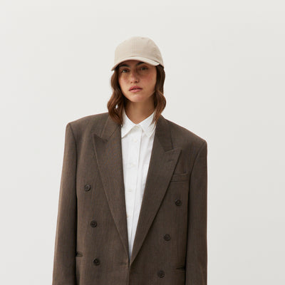 On a choisi une forme à 6 panneaux, avec un bonnet assez profond pour qu’il aille à toutes les têtes et une visière très légèrement plus longue que la moyenne, pour une question de proportion (et de protection). En somme, un parti pris sans risque : c’est une forme qui convient à toutes les formes de visage.