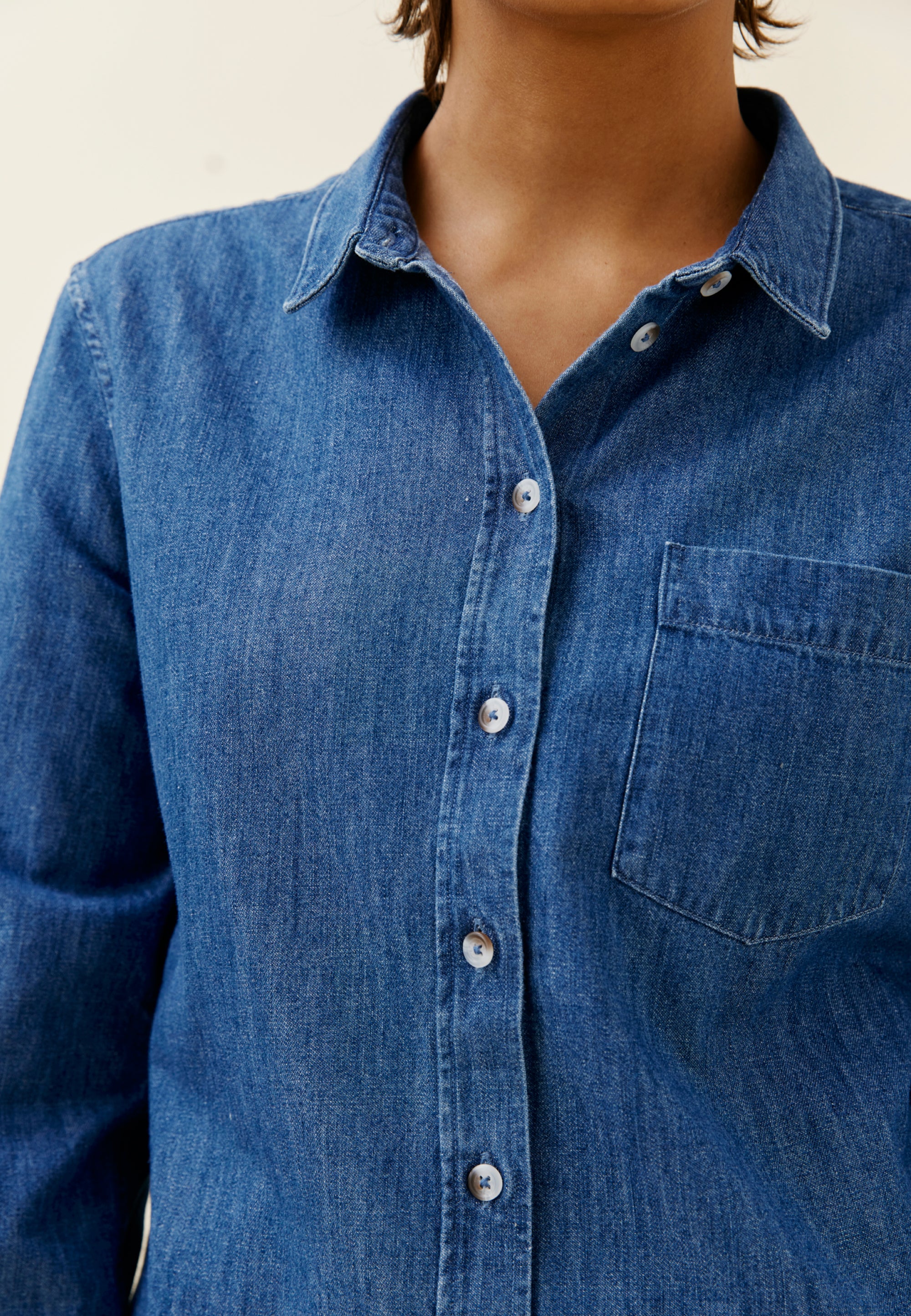 Le problème des chemises en jean en général ? Elles sont trop fines, elles se déforment, elles trouent… bref, elles sont faites dans des tissus pas très robustes. Pas de ça chez nous : on a utilisé un denim dense et souple (le même que pour notre modèle homme, qui a fait ses preuves).** **Et ce n’est pas tout : prélavage pour ne pas qu’elle rétrécisse, fixation des boutons renforcée avec la technologie Ascolite, coutures robustes… Tout est pensé pour que cette chemise vous suive for a long long time.
