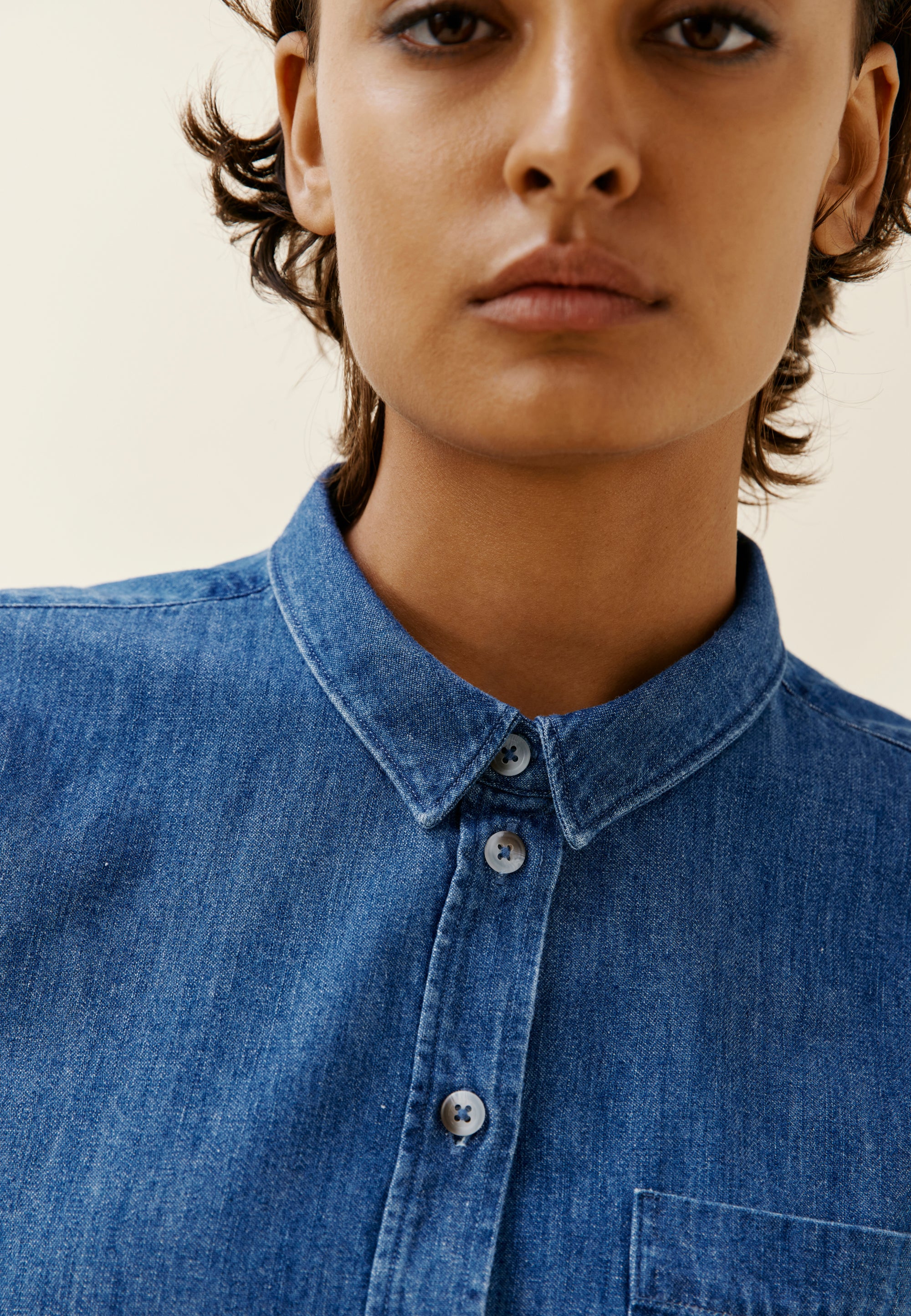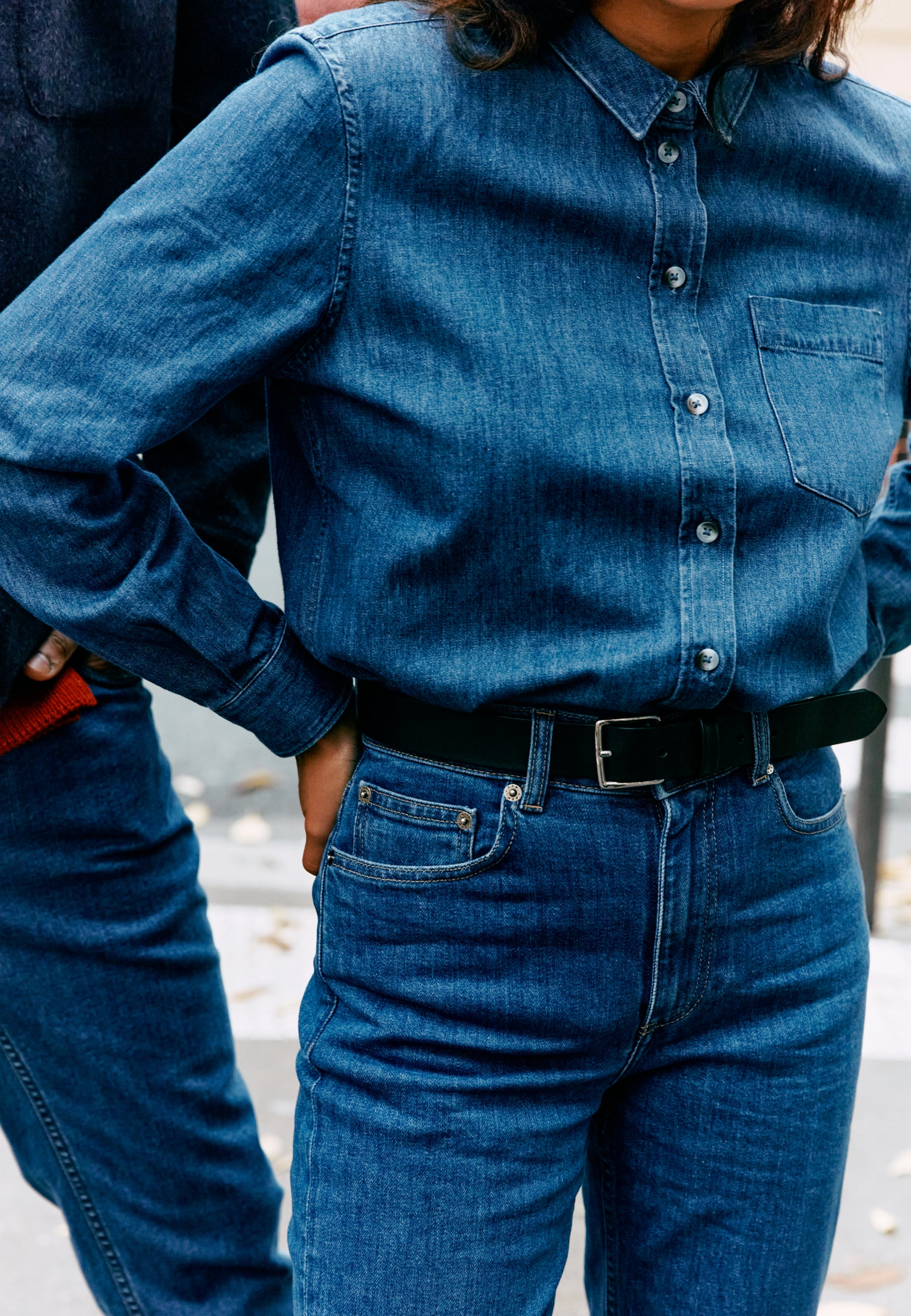 Cette chemise va super bien vieillir - c’est ce qu’il y a de génial avec le denim de qualité, ça patine avec le temps. Et on en est d’autant plus sûr qu’on a le recul de la version homme (fabriquée avec le même tissu). Comme n'importe quelle chemise en denim, elle délavera avec les lavages, particulièrement sur les zones de frottement comme les coudes ou le col.