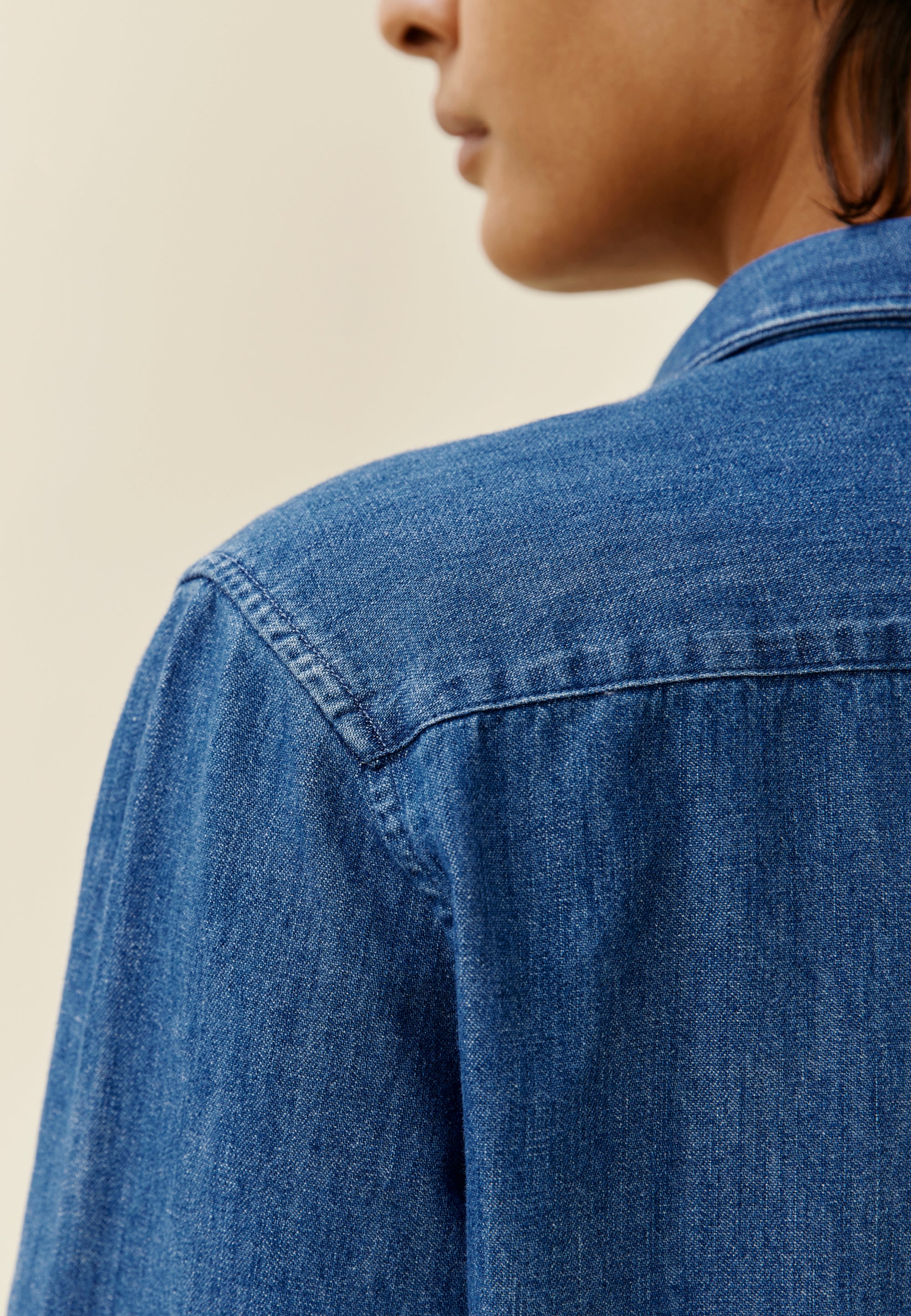 Cette chemise va super bien vieillir - c’est ce qu’il y a de génial avec le denim de qualité, ça patine avec le temps. Et on en est d’autant plus sûr qu’on a le recul de la version homme (fabriquée avec le même tissu). Comme n'importe quelle chemise en denim, elle délavera avec les lavages, particulièrement sur les zones de frottement comme les coudes ou le col.