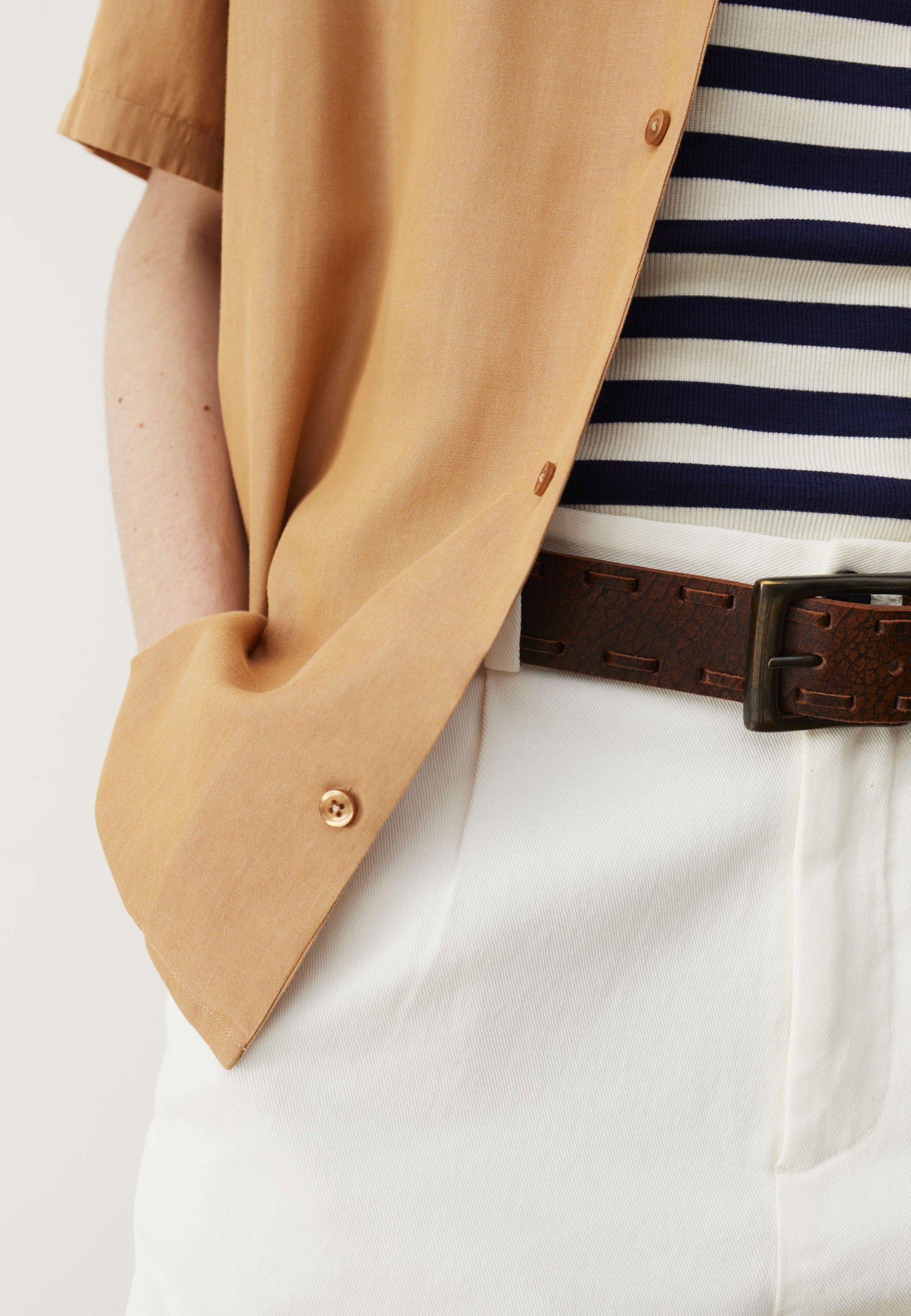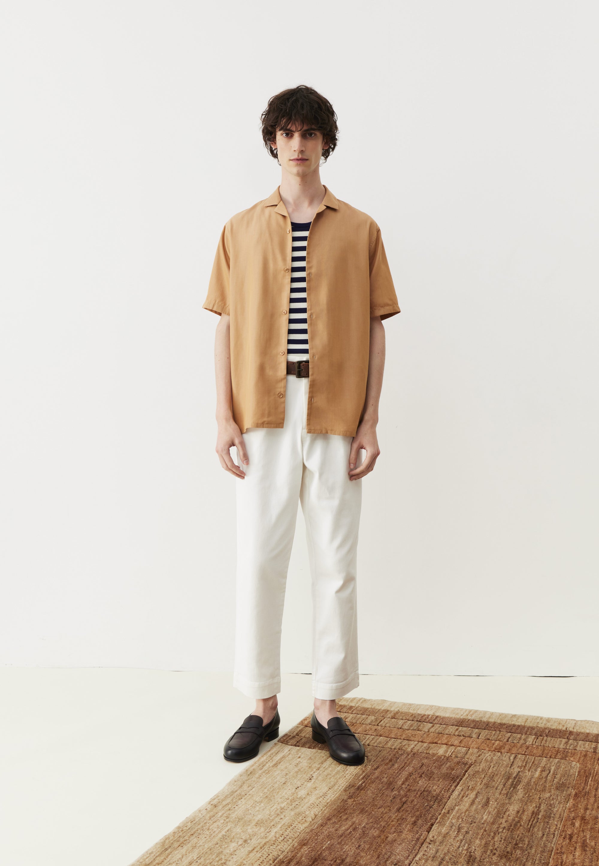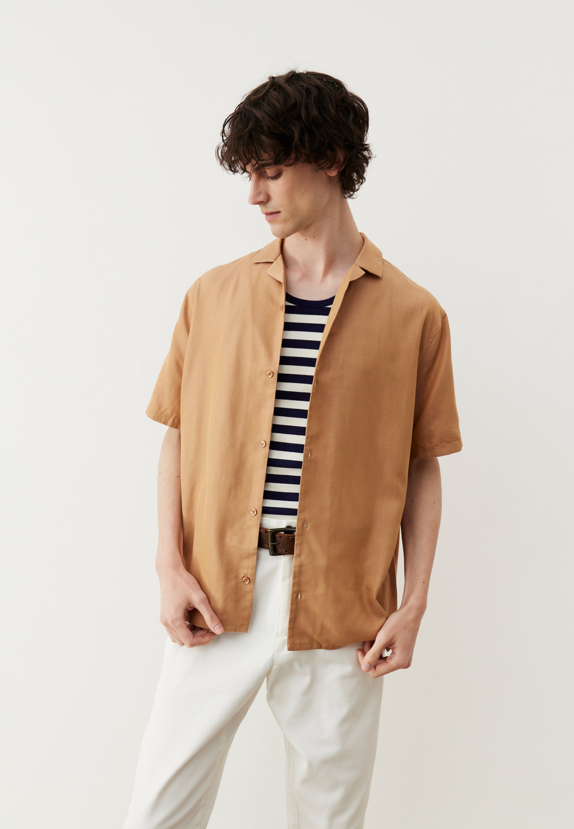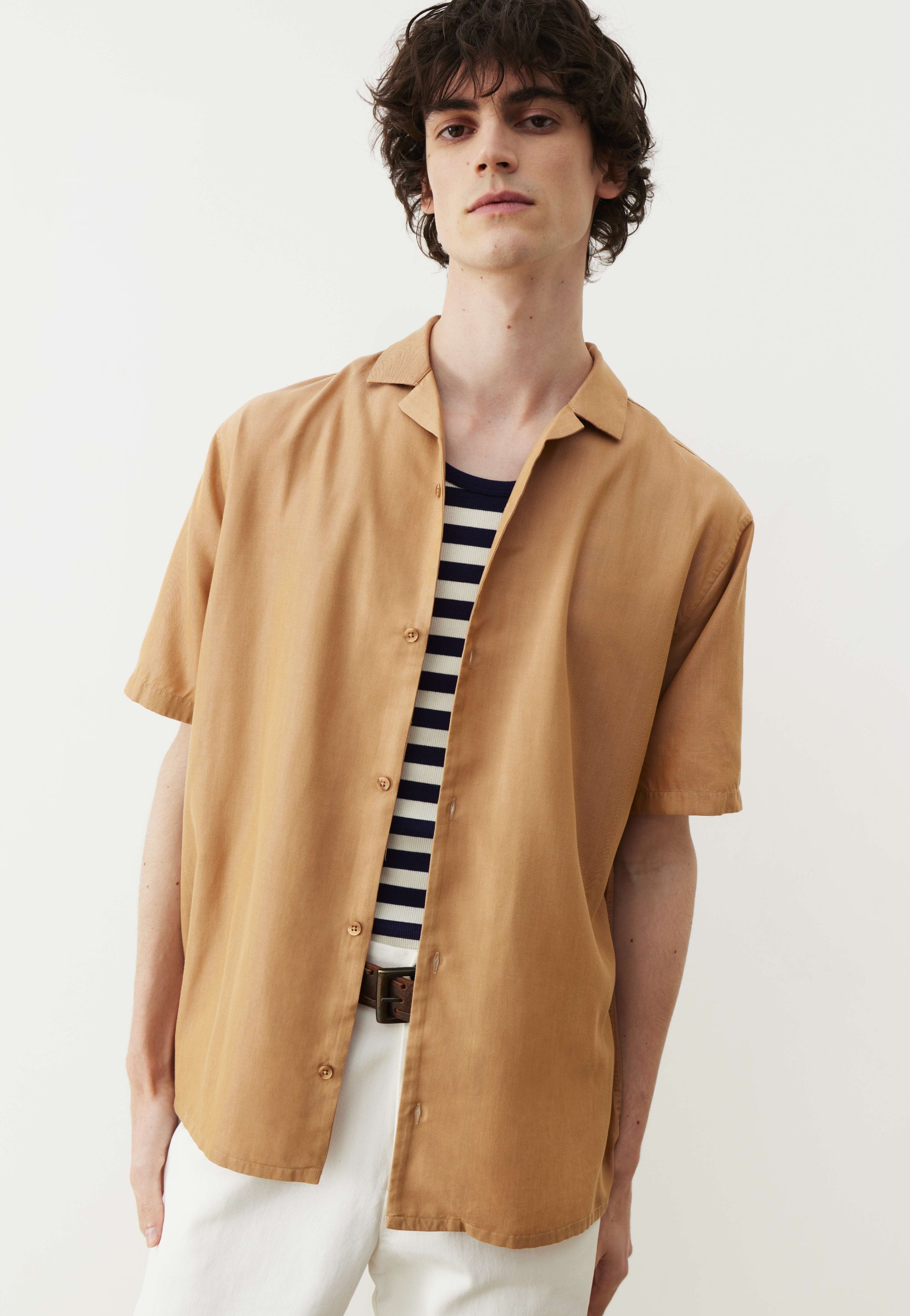 Pas besoin de faire un dessin : pour supporter la chaleur, une chemisette est la tenue la plus adaptée – juste après celle d’Adam. À condition que la coupe soit bien pensée. La nôtre est droite : cela veut dire qu’il y a suffisamment d’aisance pour permettre à l’air de circuler, éviter de transpirer ou de se sentir engoncé. Et pour terminer, on a choisi un col cubain, assez décontracté pour vos balades à la plage, et assez looké pour vos soirées d’été. Si patrón.