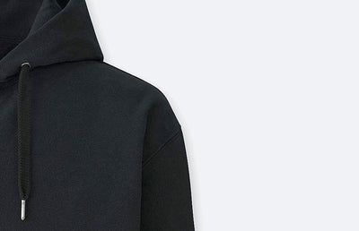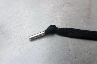Notre cordon est 100% coton tressé bien serré, et on l'a fixé en haut de la capuche pour qu'il ne se fasse pas la malle pendant vos machines. Pour les hoodies noir et bleu, on a mis un cordon ton sur ton.