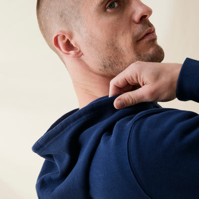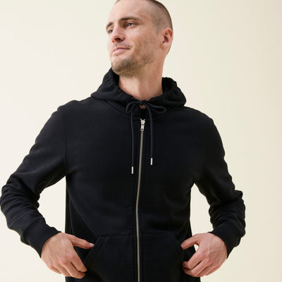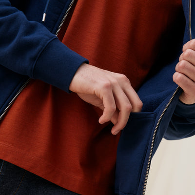 Pour faire un hoodie (ou “sweat-à-capuche-zippé”) solide, on a développé un tissu dense (420g/m2) et 100% coton bio – on a juste ajouté un fil d’élasthanne dans la ceinture et les poignets pour éviter qu’il se détende. On a choisi une coupe légèrement ajustée – mais pas trop près du corps – qui met en valeur la plupart des carrures. Côté confort, l’intérieur est gratté : c’est doux, c’est chaud, c’est doudou. Et à l'intérieur, il y a une poche secrète (enfin plus maintenant) (enfin il y a toujours une poche, mais elle n’est plus secrète puisqu’on vous l’a dit) (mais pour les gens qui vous voient dans la rue, elle reste secrète) (c’est bientôt le week-end ?).