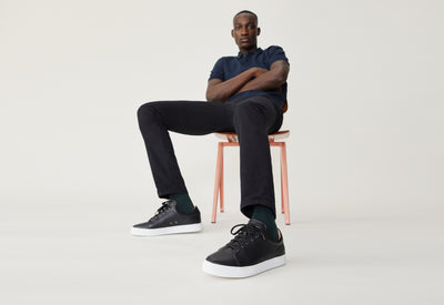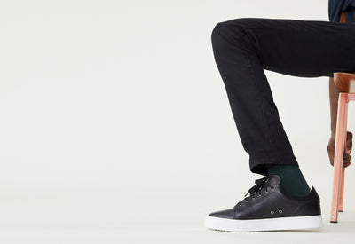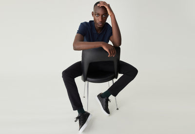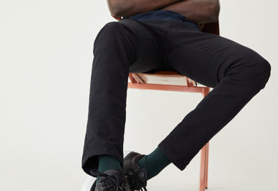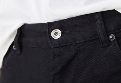 Nous on dit “jean” mais techniquement, ce pantalon, c’est ce qu’on appelle un “5 poches” : la teinture est faite sur le tissu et non sur le fil, et on a utilisé un colorant dit réactif qui pénètre au plus profond de la fibre contrairement aux colorants pigmentaires habituellement utilisés dans les jeans. Ce que ça change ? Ce jean noir délave bien moins vite qu'un jean classique.