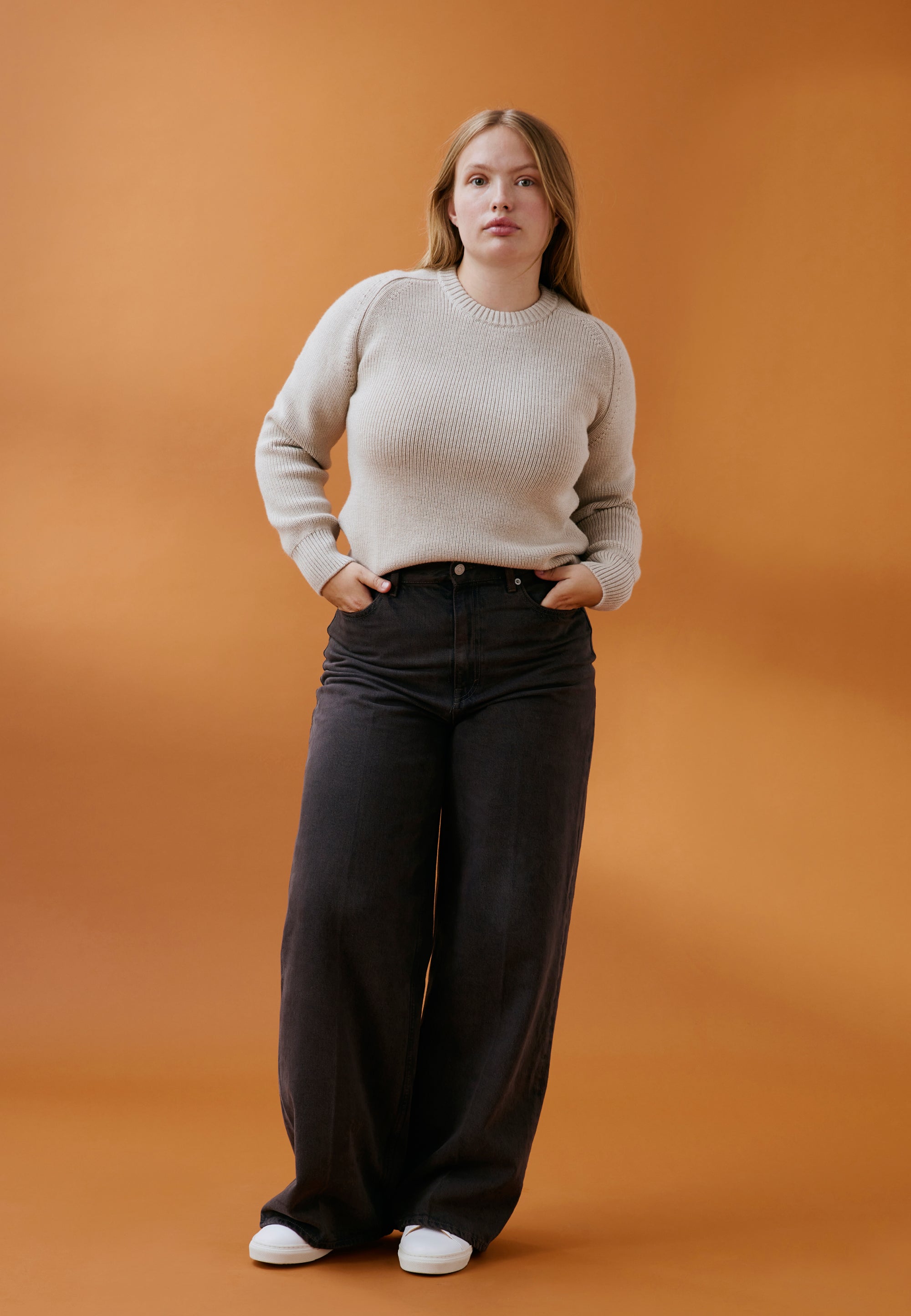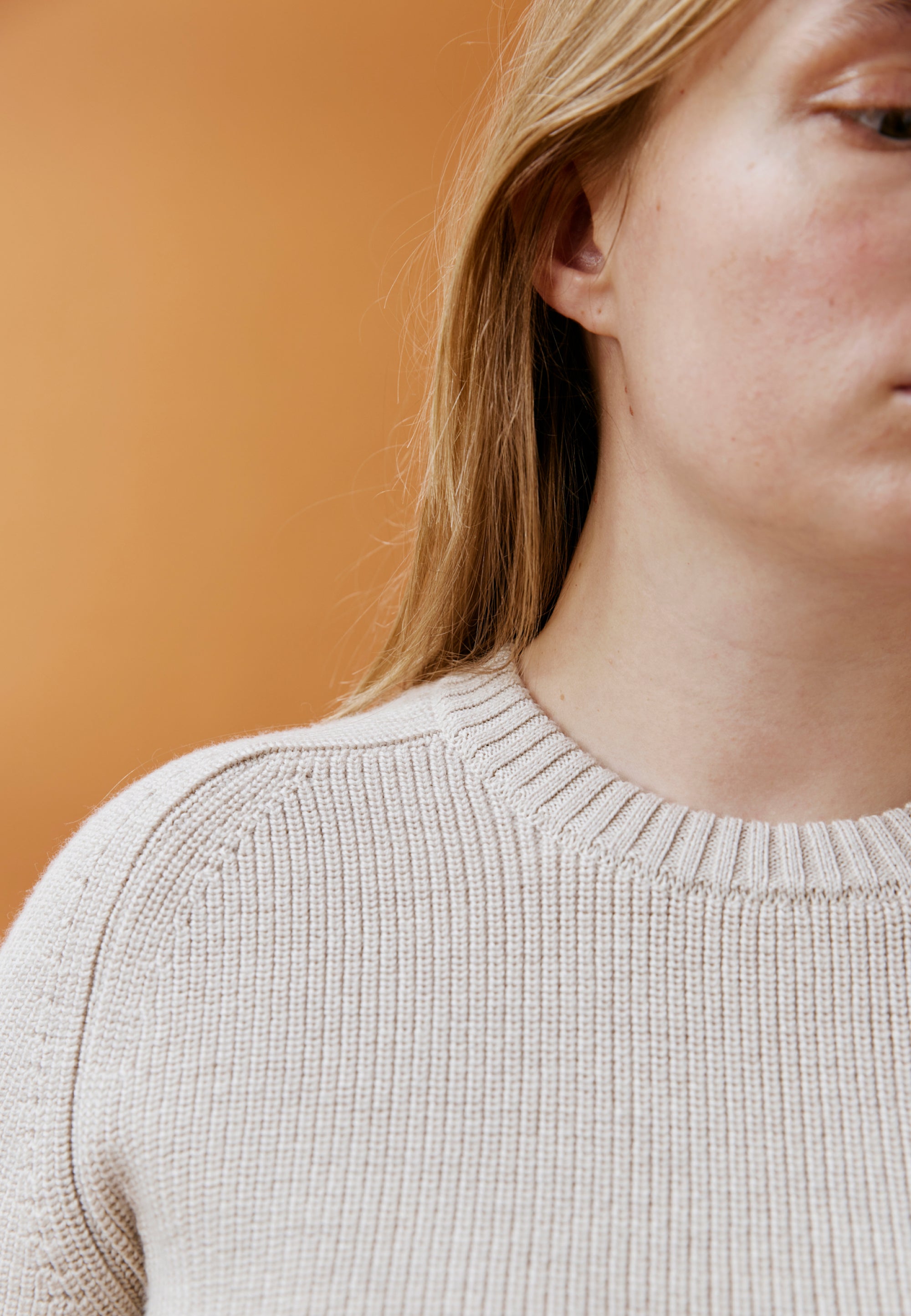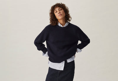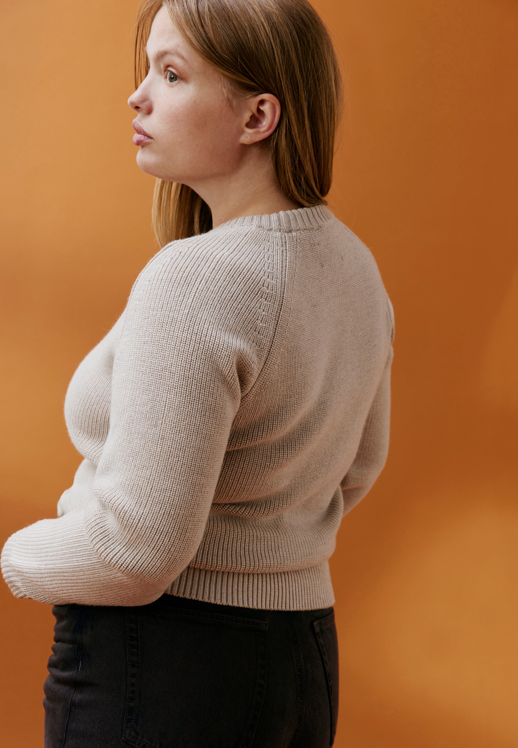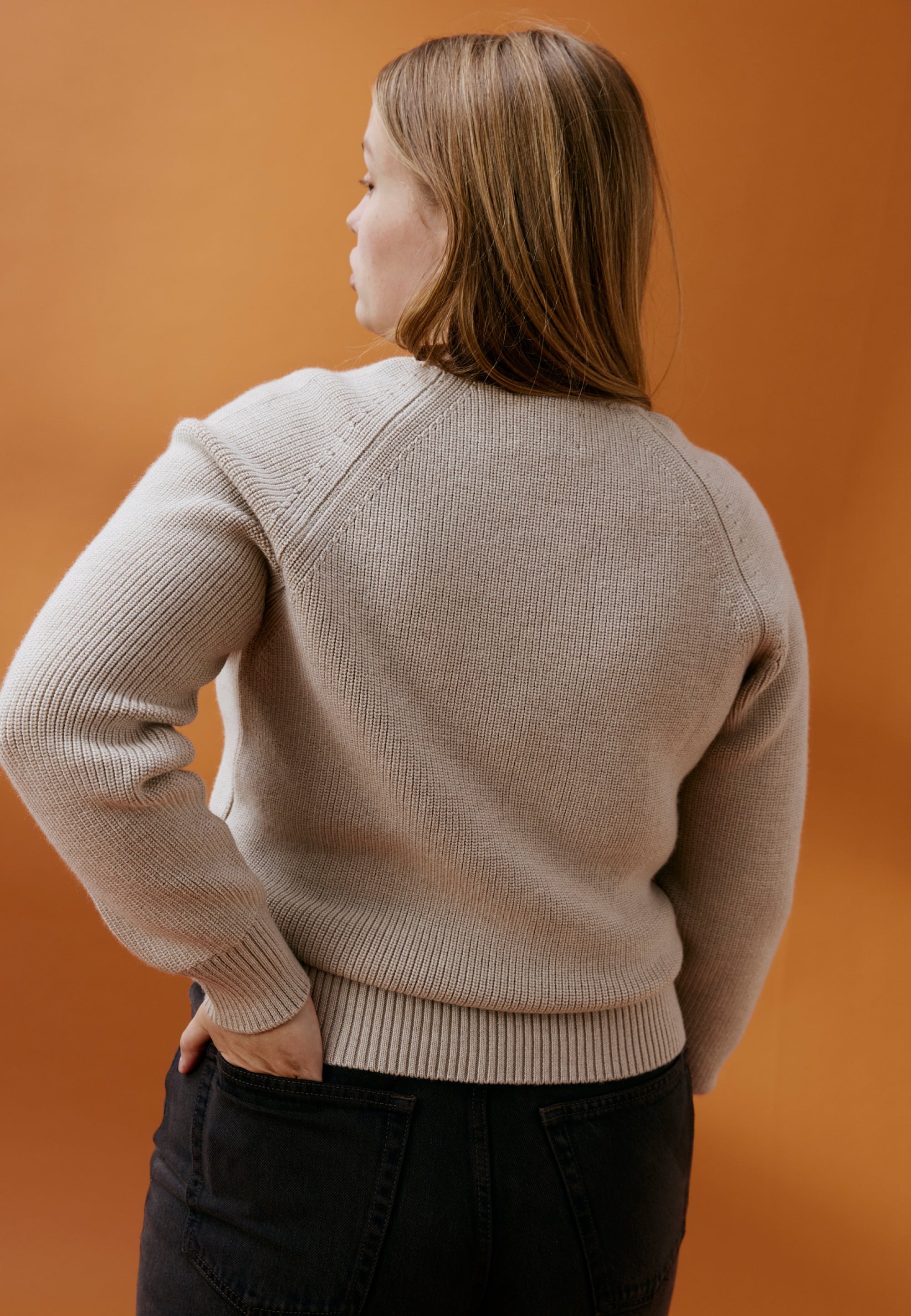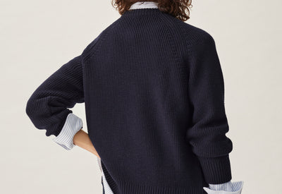 Le pull est légèrement ample, un peu "oversize", et l’ouverture des manches est généreuse pour laisser passer une chemise. Mais il n’est pas trop large non plus pour pouvoir enfiler un manteau par-dessus, et pas trop court pour que le froid ne rentre pas au niveau du bassin. L’assemblage est “fully fashioned” pour des coutures moins épaisses et plus agréables. Et on a choisi un point appelé “maille perlée” : c’est très beau mais surtout c’est naturellement extensible, et ça c’est bon pour le confort.