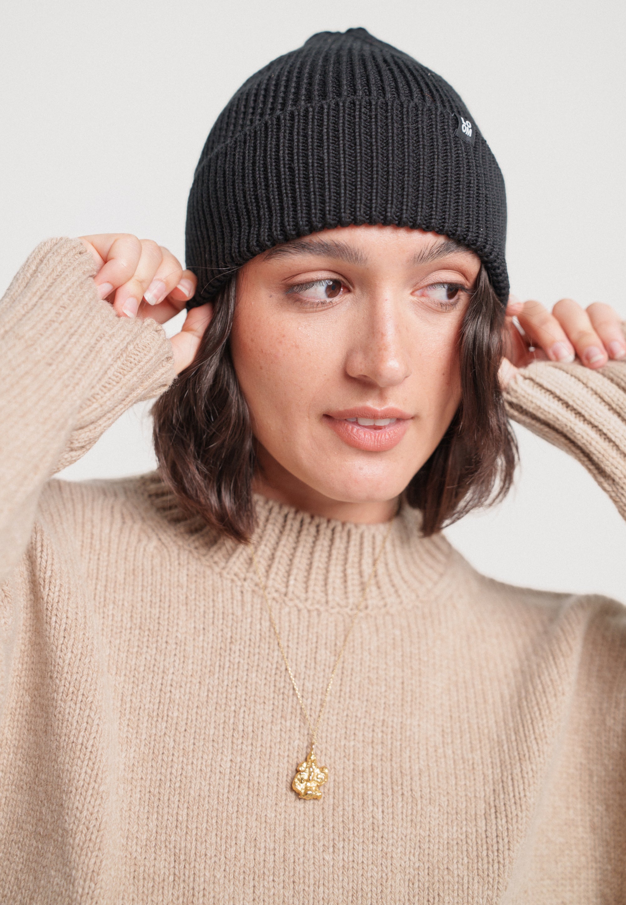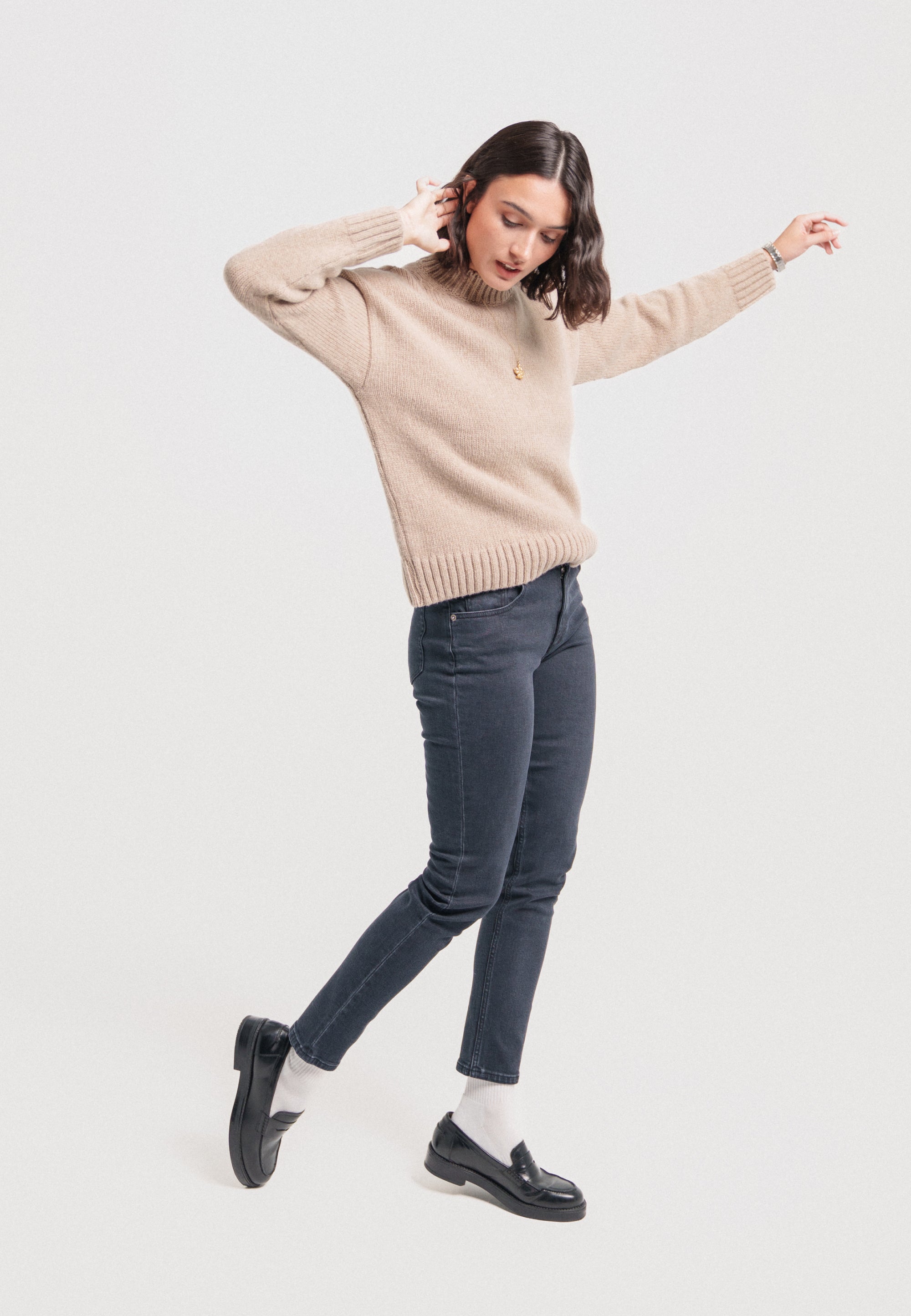 On voulait un pull qui ait de l’allure : on a opté pour une coupe droite, un col montant et des épaules déportées. Et on voulait un pull qui tienne bien chaud : on l’a donc tricoté à partir d’un fil “cardé” (c’est-à-dire légèrement poilu) de laine mérinos supergeelong, issue de la première tonte du mouton. Le tout made in Roanne, berceau du textile français.