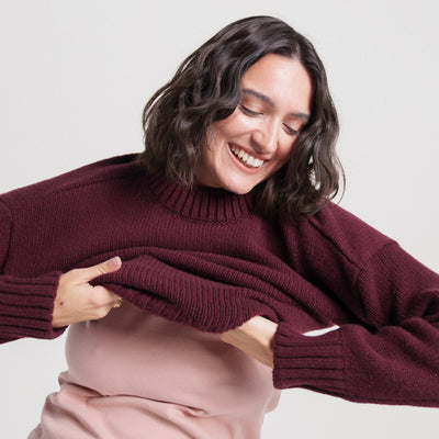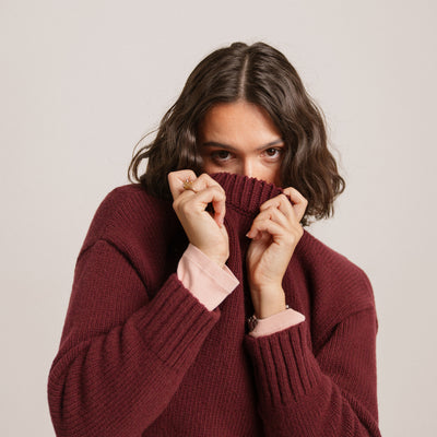Pour ce pull, on voulait une forme moderne et facile à porter. On a donc dessiné une coupe droite, un col qui monte sur le cou et des épaules déportées. Côté couleur, le beige légèrement chiné va éclairer votre hiver, et cet aubergine sombre va souligner cette aura mystérieuse qui vous caractérise si bien (non ?).
