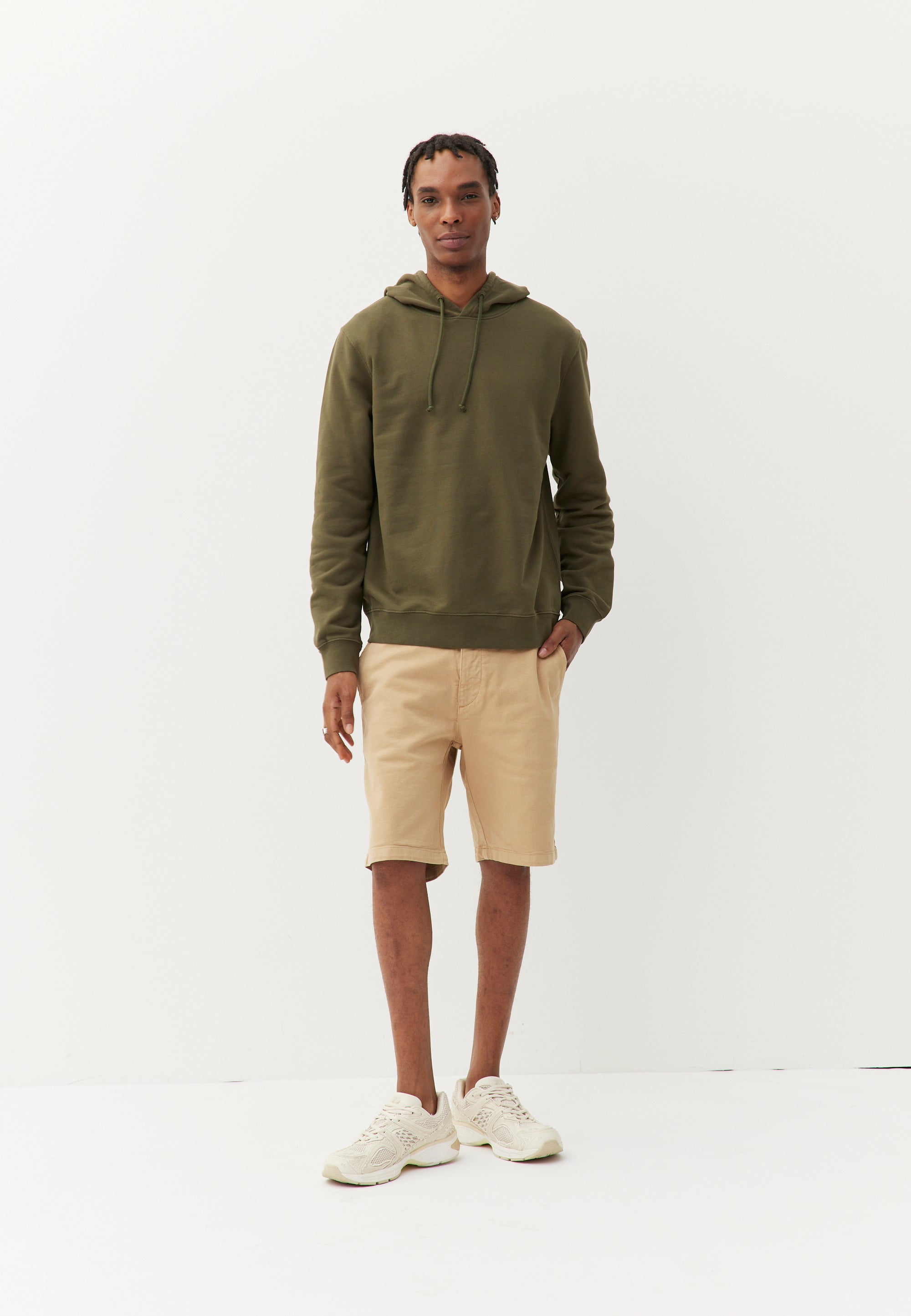 Pour ce sweat à capuche, on a développé un tissu dense (420g/m2) et 100% coton bio pour qu’il garde une belle tenue – on a juste ajouté un fil d’élasthanne dans la ceinture et les poignets pour éviter qu’il se détende. Pour la coupe, on a opté pour une silhouette affûtée et sans poche kangourou sur le devant, qui finit toujours par se détendre avec le temps.