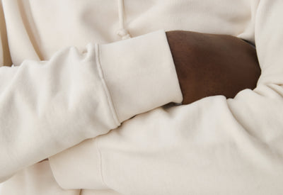 Pour ce sweat, nous n'avons pas utilisé de teinture - cet écru, c’est la vraie couleur du coton (bio). Cette couleur lumineuse va avec la plupart des carnations, donne du style à vos tenues et n’est pas si difficile à entretenir - un pschitt de produit sur les taches et il redevient immaculé après lavage. Cerise sur le gâteau : en squizzant l’étape de teinture, on fait aussi l’impasse sur plein de produits chimiques et de gaz à effet de serre.