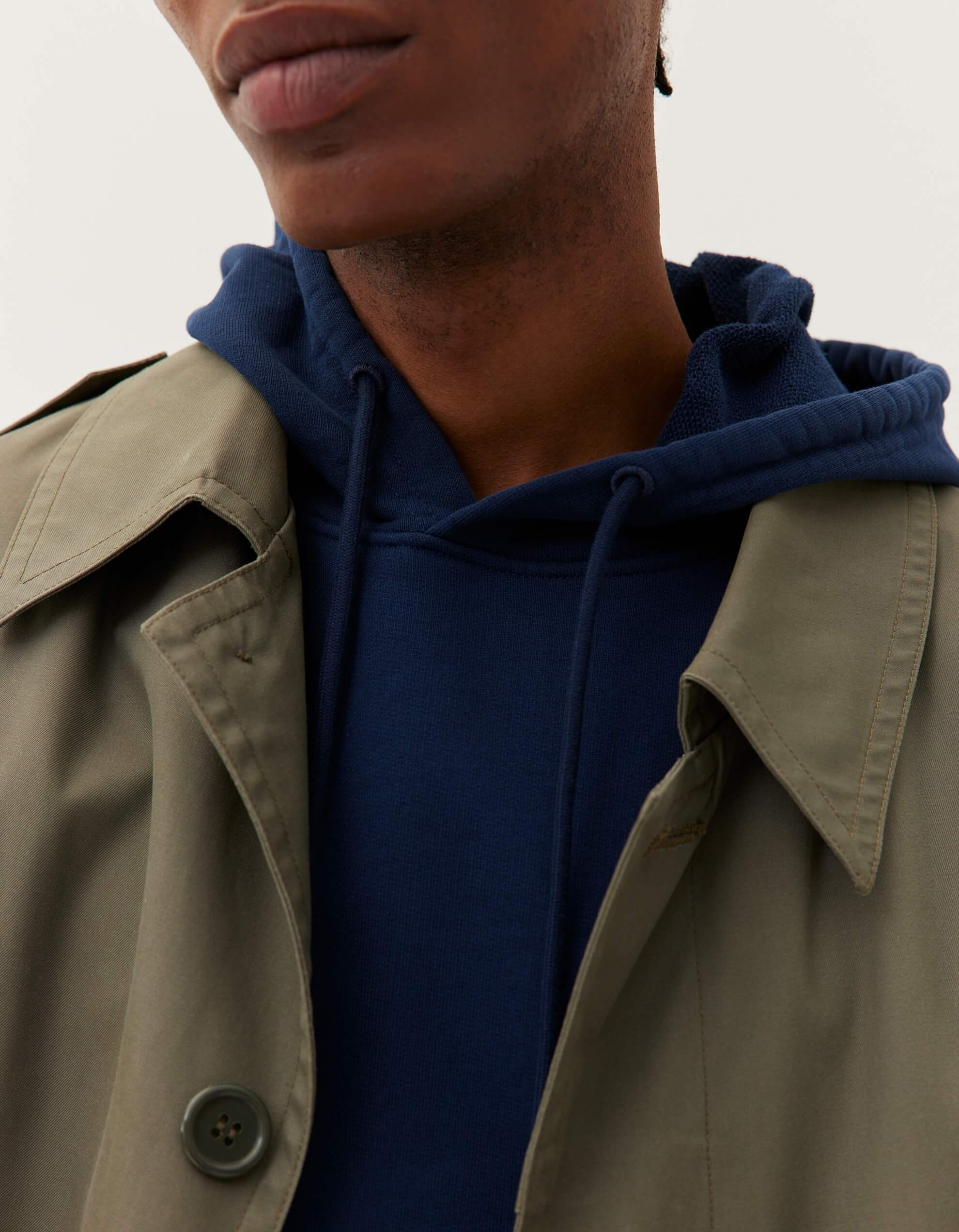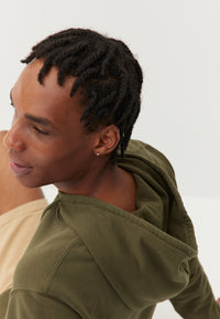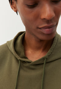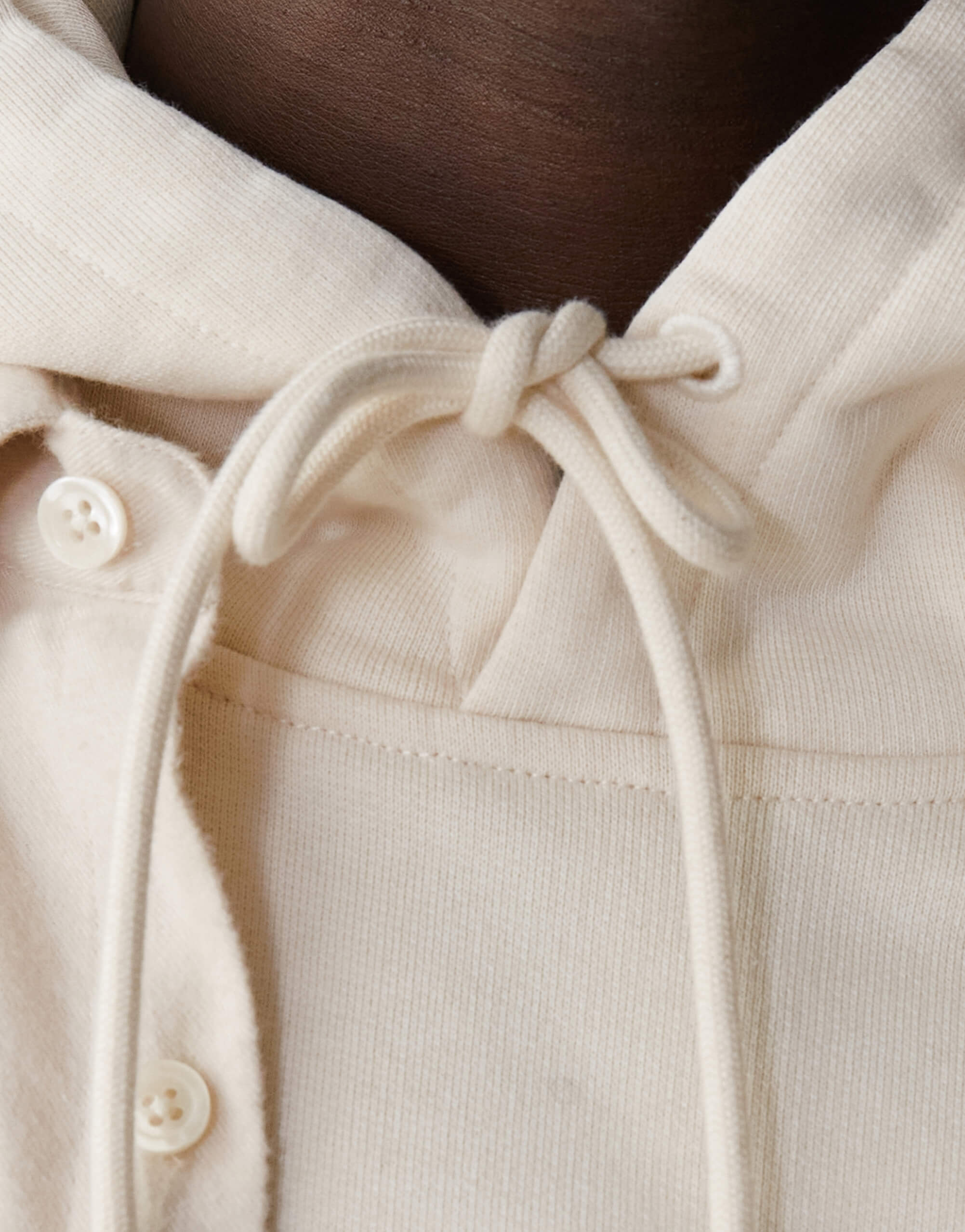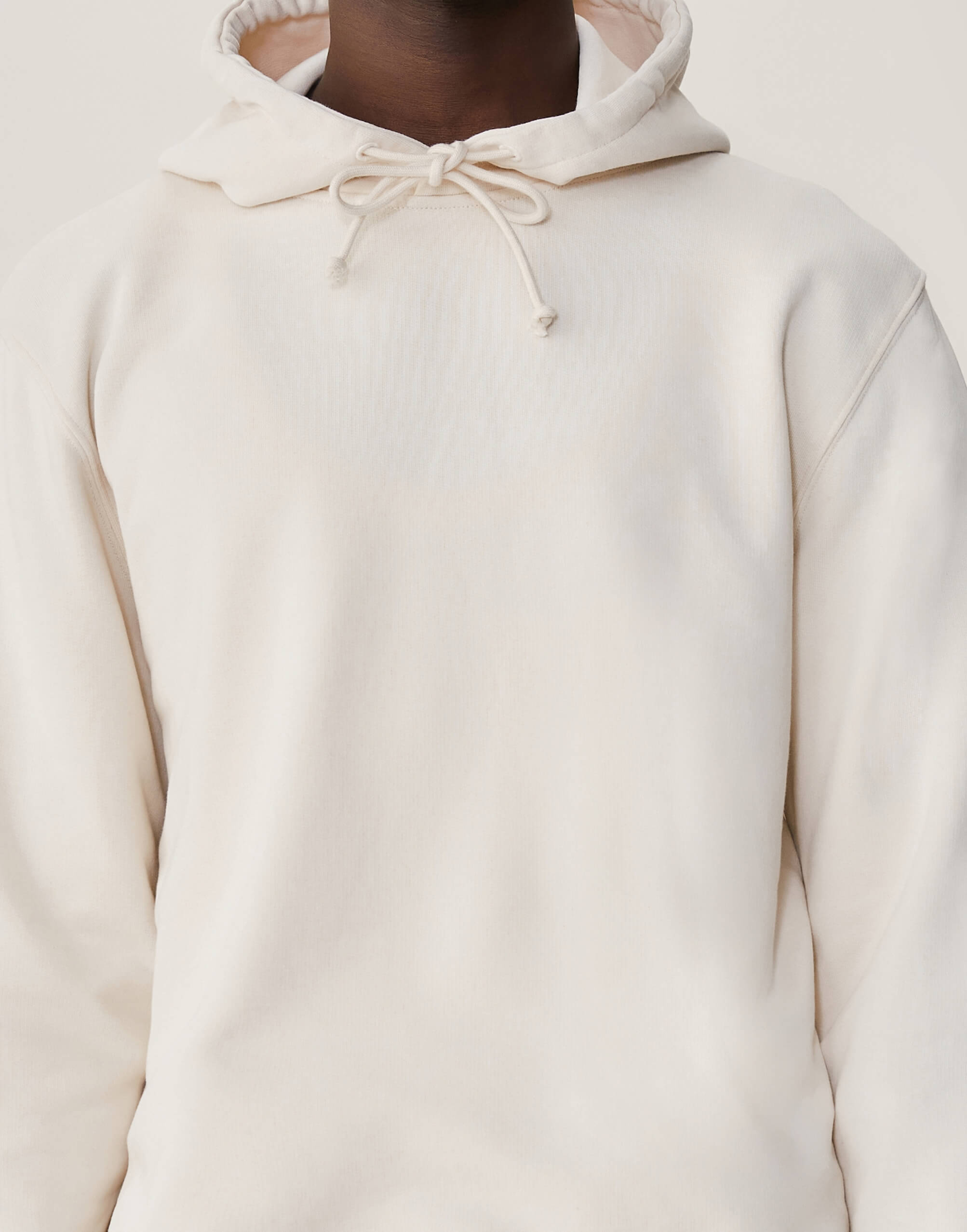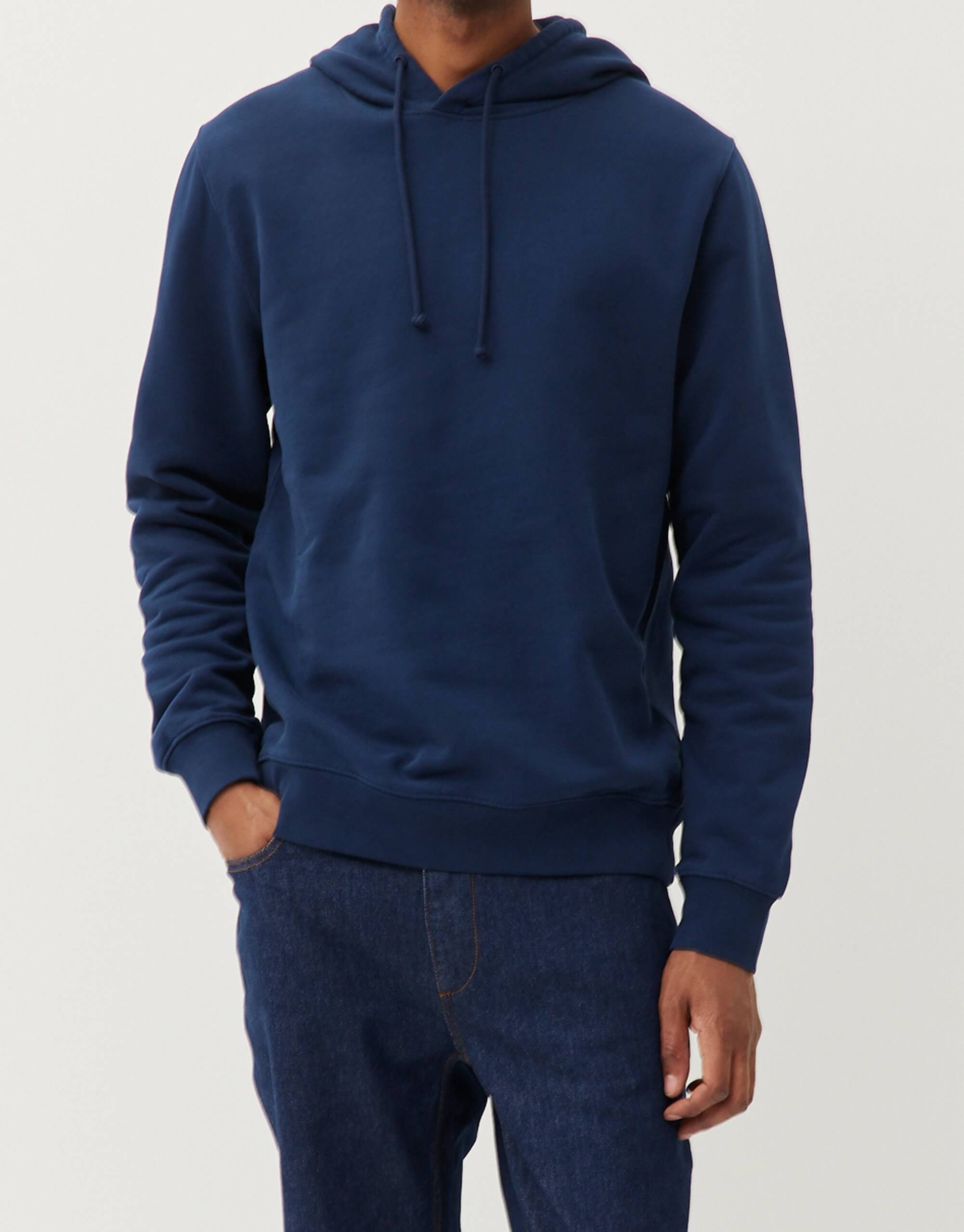 Pour ce sweat à capuche, on a développé un molleton dense (420g/m2) et 100% coton bio pour qu’il garde une belle tenue – on a juste ajouté un fil d’élasthanne dans la ceinture et les poignets pour éviter qu’il se détende. Et on a renoncé à la poche kangourou sur le devant, qui finit toujours par se détendre avec le temps.