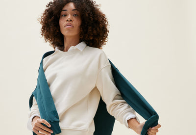 D’après les réponses à notre questionnaire, un des problèmes principaux des sweats, c’est qu’ils se déforment avec le temps. Une solution aurait pu être de rajouter du polyester - mais on a préféré éviter car il y avait une autre voie : choisir une matière 100% coton suffisamment dense, de 420g/m2 pour limiter la détente de votre sweat au cours des années.